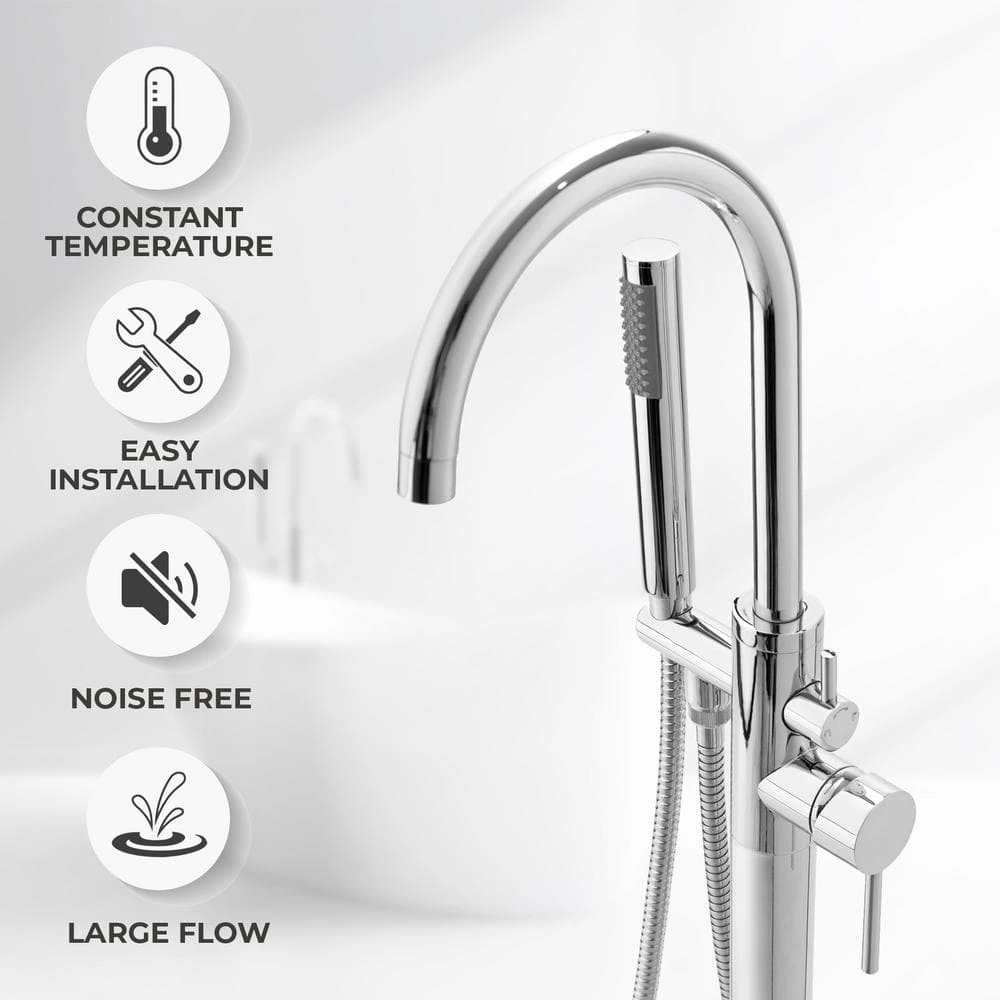 Modern and timeless, AKDY’s TF0021 freestanding tub filler has a refined look to match any bathtub and bathroom decor. A stunning chrome finish is accented by smooth lines and a traditional curved neck. An included hand shower lets you have greater freedom and mobility to fully relax without compromise. All tub faucet fillers have a flow rate of 4.1 GPM.