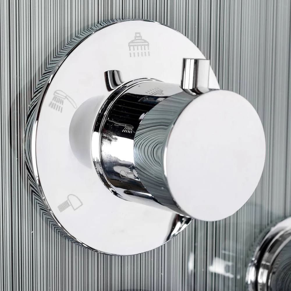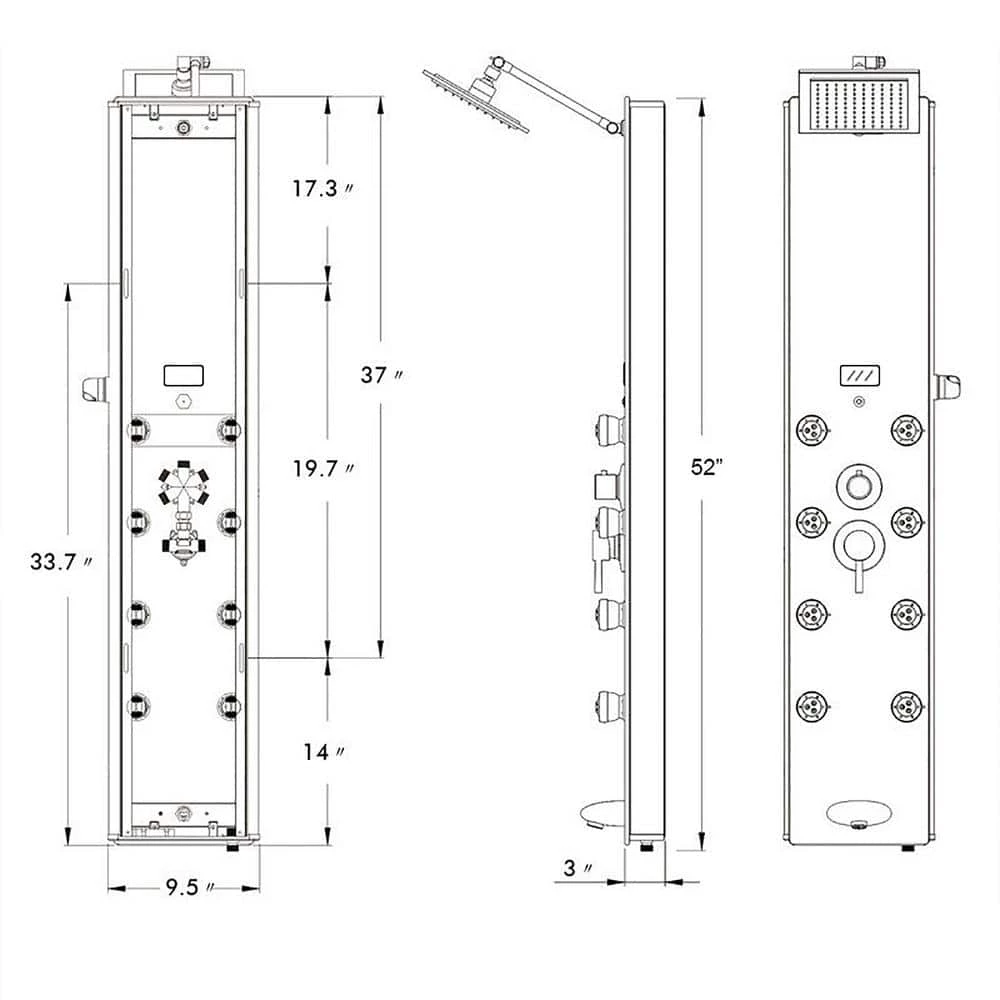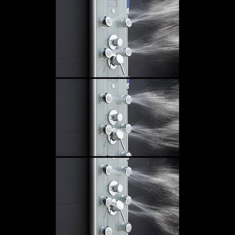 Let the day’s stress fade away with our 52 in. shower panel in stunning gray stripe. With 8-massaging body jets, a handheld wand, tub filler and a rainfall shower head, this shower panel has all the bells-and-whistles a modern bathroom needs. An LED display always shows the current temperature for added convenience and a more tailored shower. It’s beautiful tempered glass overlay design brings a modern and sophisticated look to your bathroom renovation.