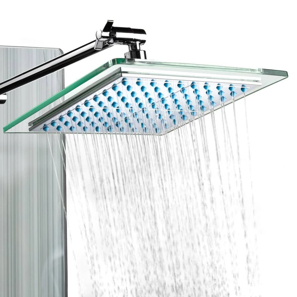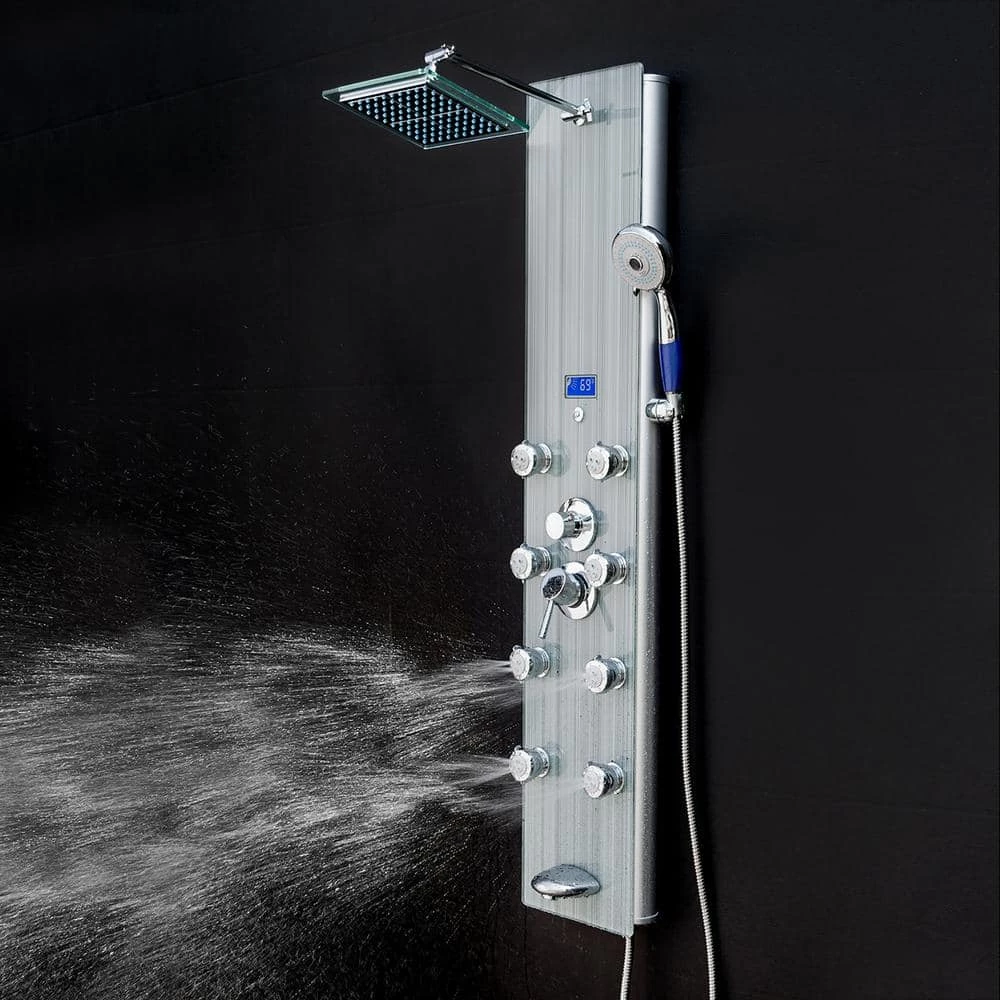 - Slimline luxury shower panel has built-in LED temperature display, overhead rainfall showerhead, adjustable high-powered body massage jets, tub spout and high-efficiency multi-function handheld shower wand