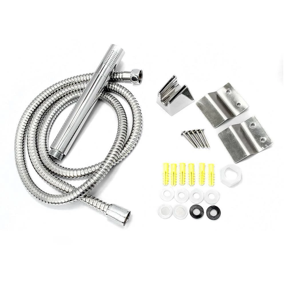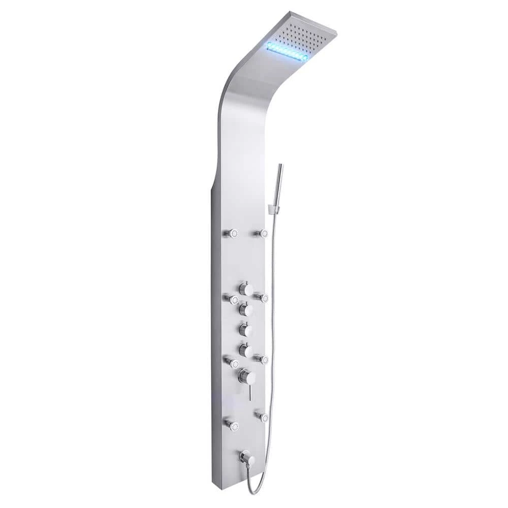 A brushed stainless-steel shower panel with the power to simultaneously use different combinations with the front panel controls. This AKDY SP0132 63 shower panel brings you a rainfall / waterfall overhead shower with eight body jets and a handheld wand that whisk you away into serenity. Beautiful blue LED lights glisten with the rainfall or waterfall shower head. The LED lights are perfect in minimal light situations and amazing to view the color in clarity. This shower panel has easy to use controls and makes it an incredible experience every time you get into your shower. The shower panel material is made with stainless steel and comes with a handheld shower wand.