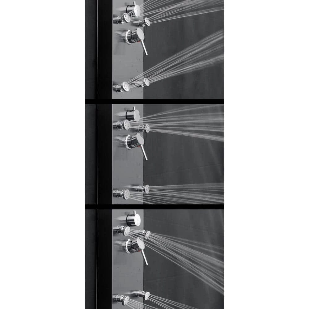 - Slimline luxury shower panel has built-in rainfall waterfall showerhead, high-powered body spray jets, and high-efficiency handheld shower wand