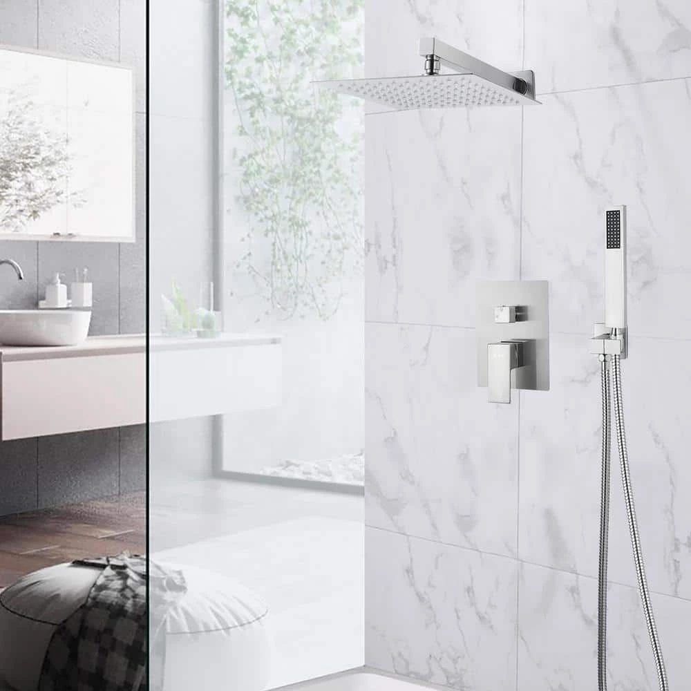 Shower Faucet with Valve and Shower Head Systems Wall Mounted Shower Combo Set for Bathroom. Integrated diverter makes it simple to switch between shower faucet and handheld shower. The in-wall hidden installation design gave an elegant appearance in any bathroom.
