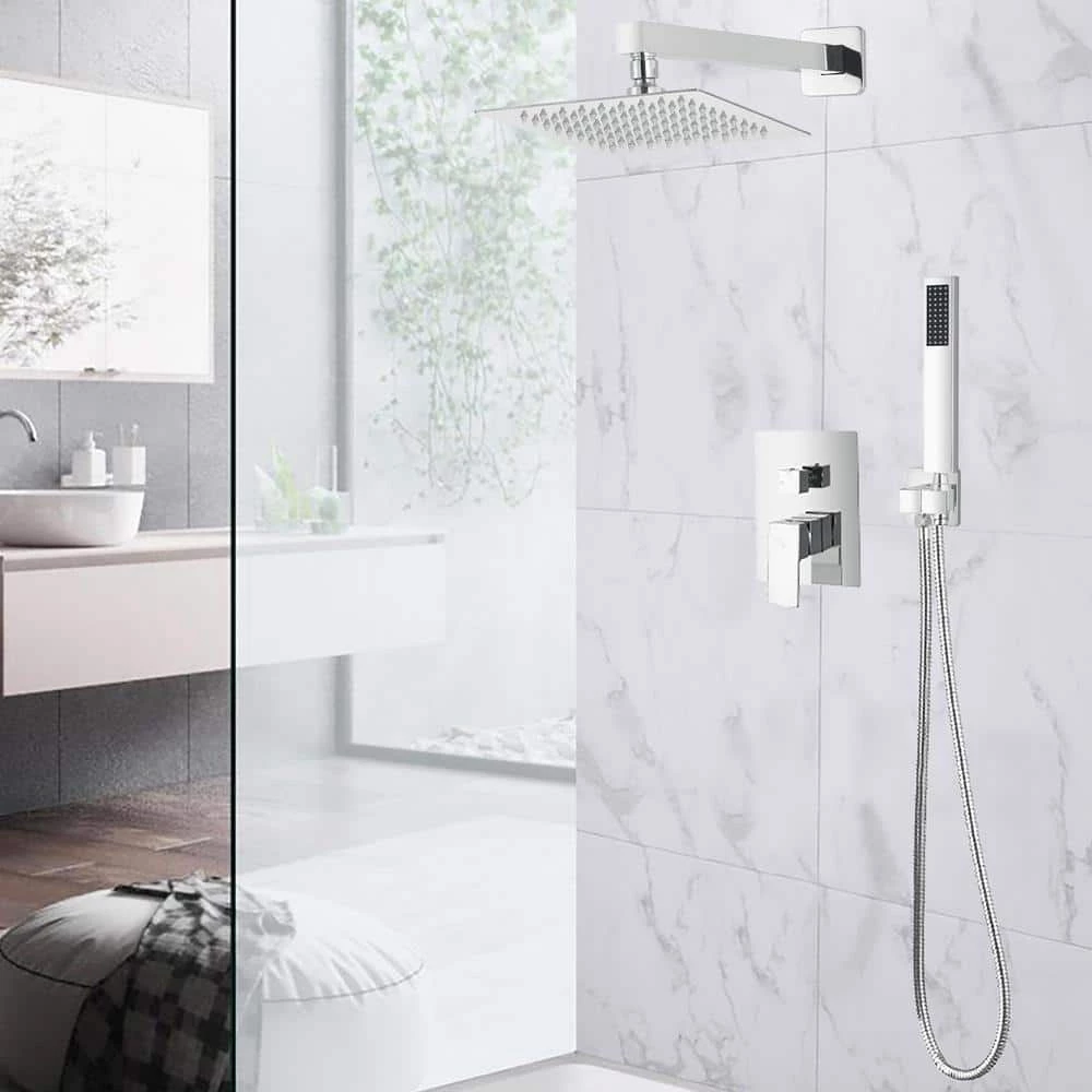 Shower Faucet with Valve and Shower Head Systems Wall Mounted Shower Combo Set for Bathroom. Integrated diverter makes it simple to switch between shower faucet and handheld shower. The in-wall hidden installation design gave an elegant appearance in any bathroom.