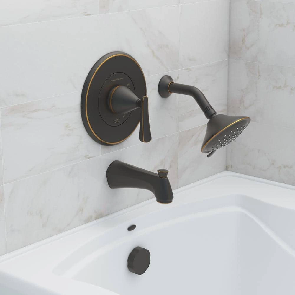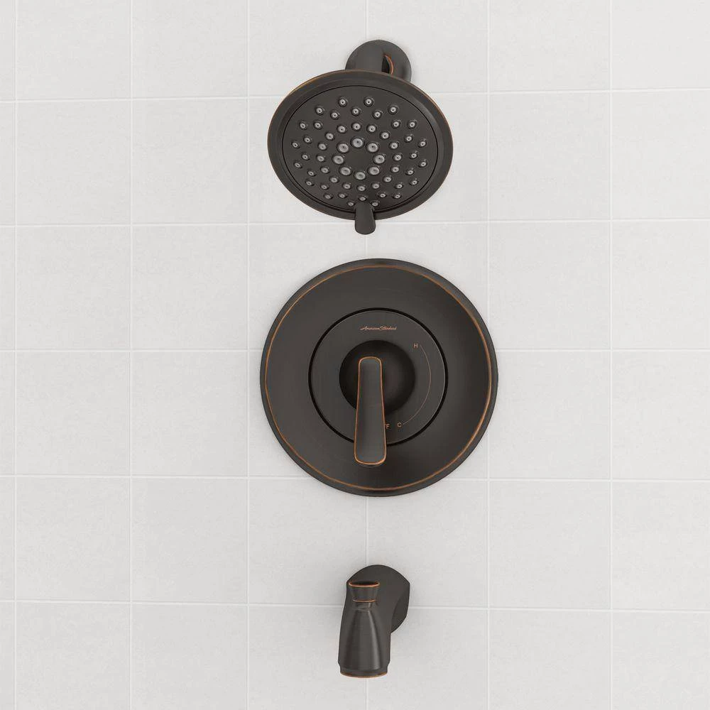 Effortless elegance and leading-edge style combine to make American Standard’s Chatfield Tub and Shower Faucet the perfect choice for your bath. Striking in its design simplicity, the subtle and sweeping curves are inspired by nature itself. A single lever handle allows you to fine-tune temperature, while the 3-function showerhead is WaterSense approved and offers a spa-like experience. An anti-scald valve also protects your family from unexpected changes in water temperature and pressure. Coordinate the look with a matching Chatfield centerset or widespread faucet to create a bathroom you’ll love.