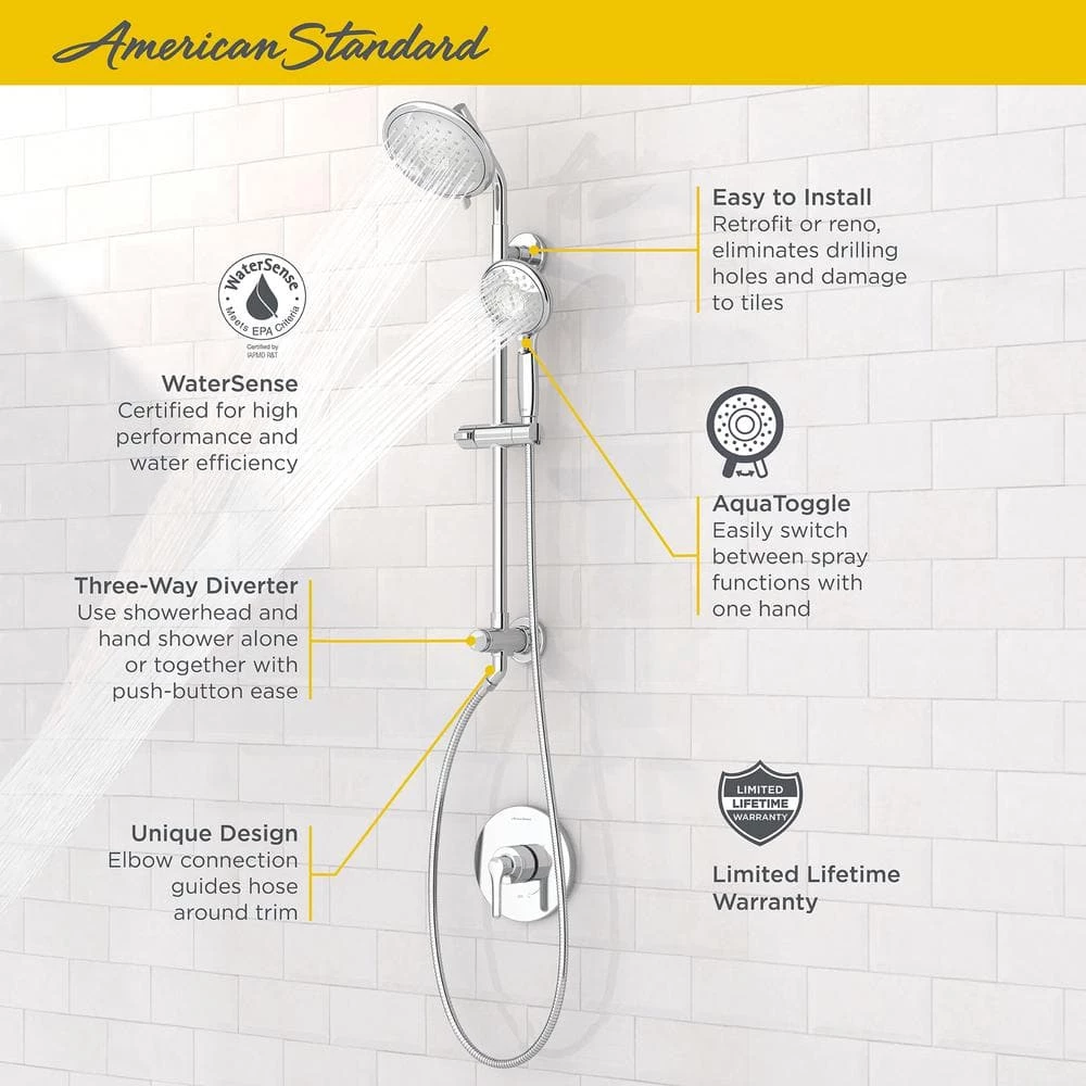 The 3-in-1 versatility of the Spectra Versa Shower System from American Standard allows everyone in the family to enjoy a truly personalized shower. Indulge in four soothing spray functions from 7 showerhead and hand shower, individually or simultaneously, easily switching between both with the push-button diverter. Slide bar features an Easy Glide bracket to adjust the height of the hand shower. Designed for hassle-free installation using existing plumbing, Spectra Versa eliminates the need to drill or damage tile, transforming an ordinary shower in an extraordinary spa experience in just 30 minutes.