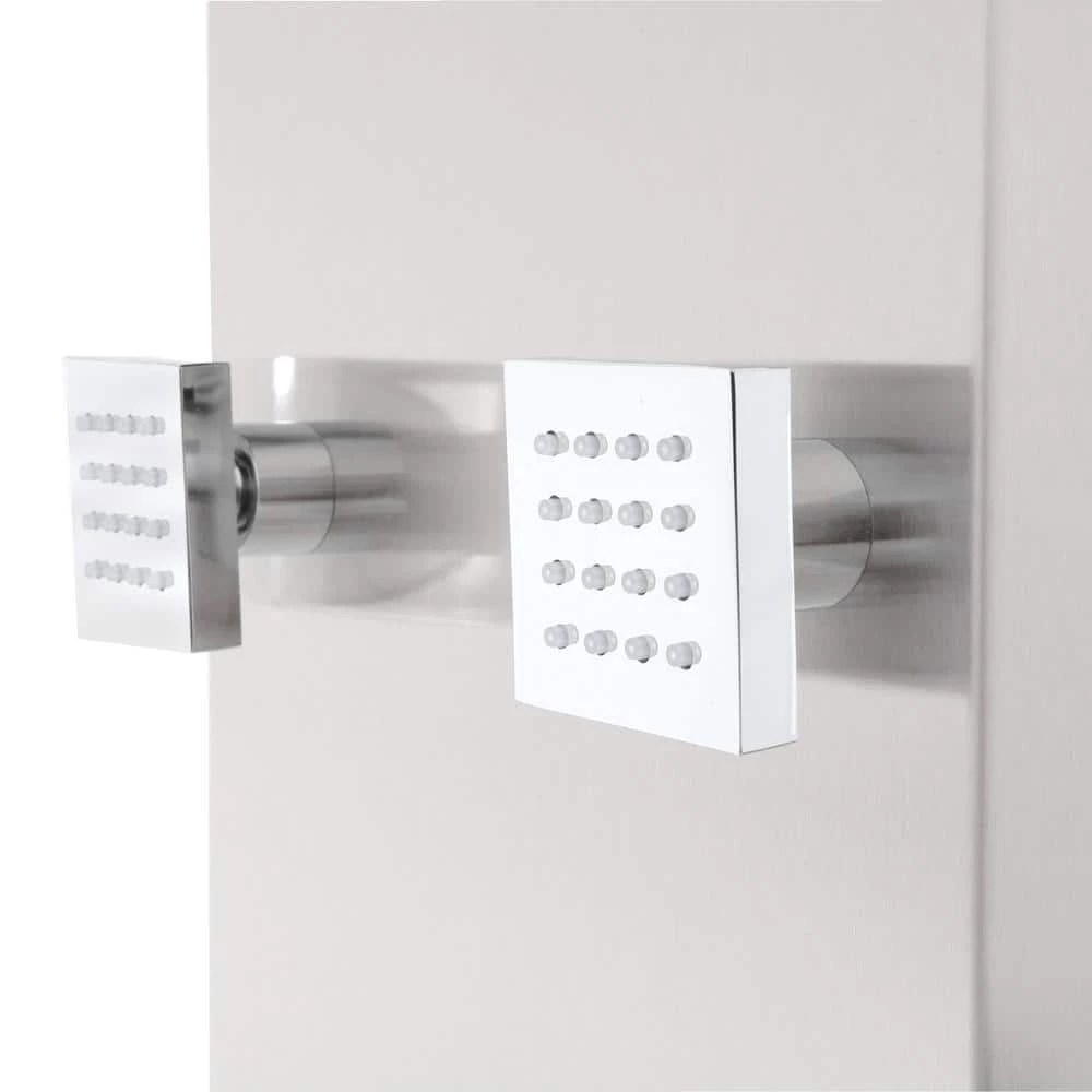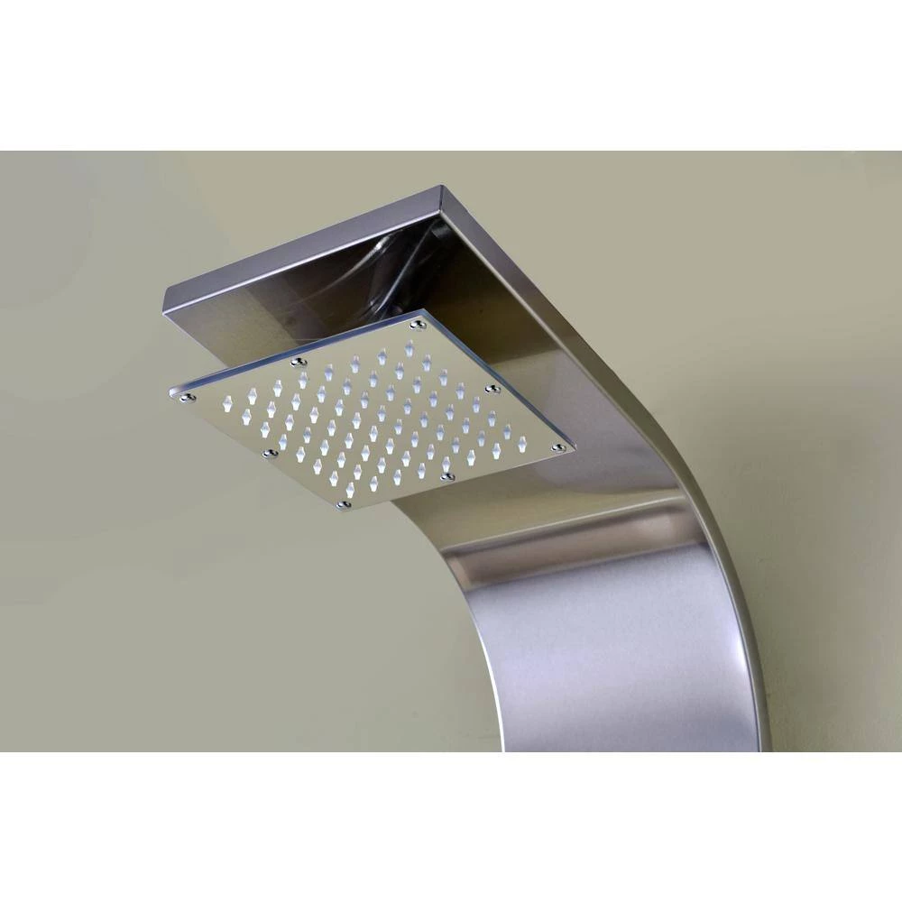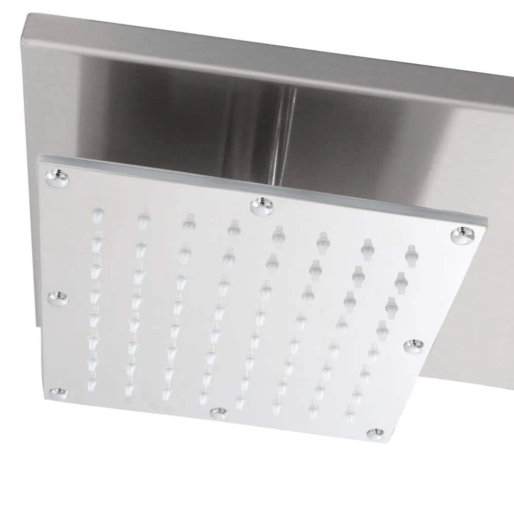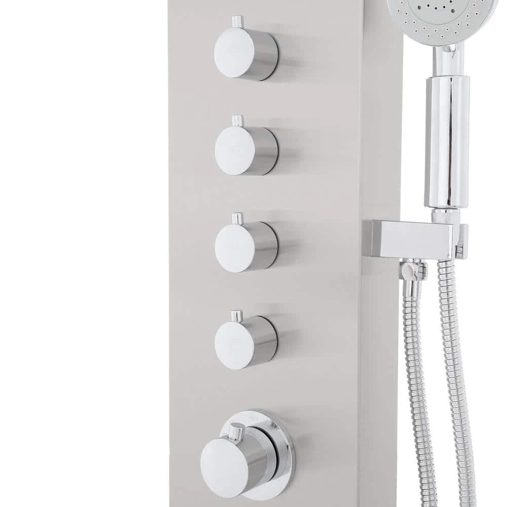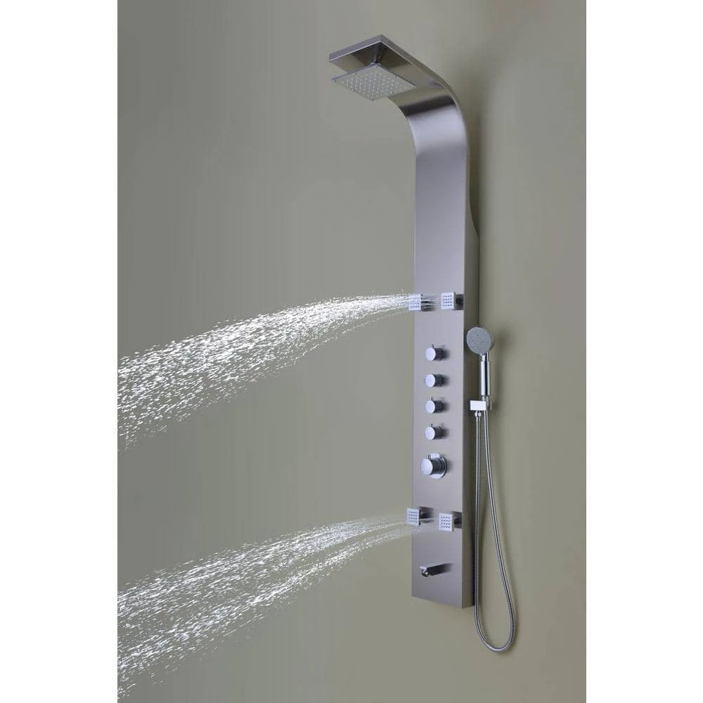Enjoy a one-of-a-kind shower experience! Our ANZZI Echo shower panel features hard edged, 90° modernist angles that are laser cut in stainless steel and highlighted by a brushed finish. Four swiveling Acu-Stream jets direct soothing streams that massage the body, while the swiveling Heavy Rain shower head releases a soothing cascade of water from above. The Euro-Grip handheld sprayer has a reach of up to 60 inches, so you can direct water wherever you want it to go. Everything is controlled through eight simple knobs.