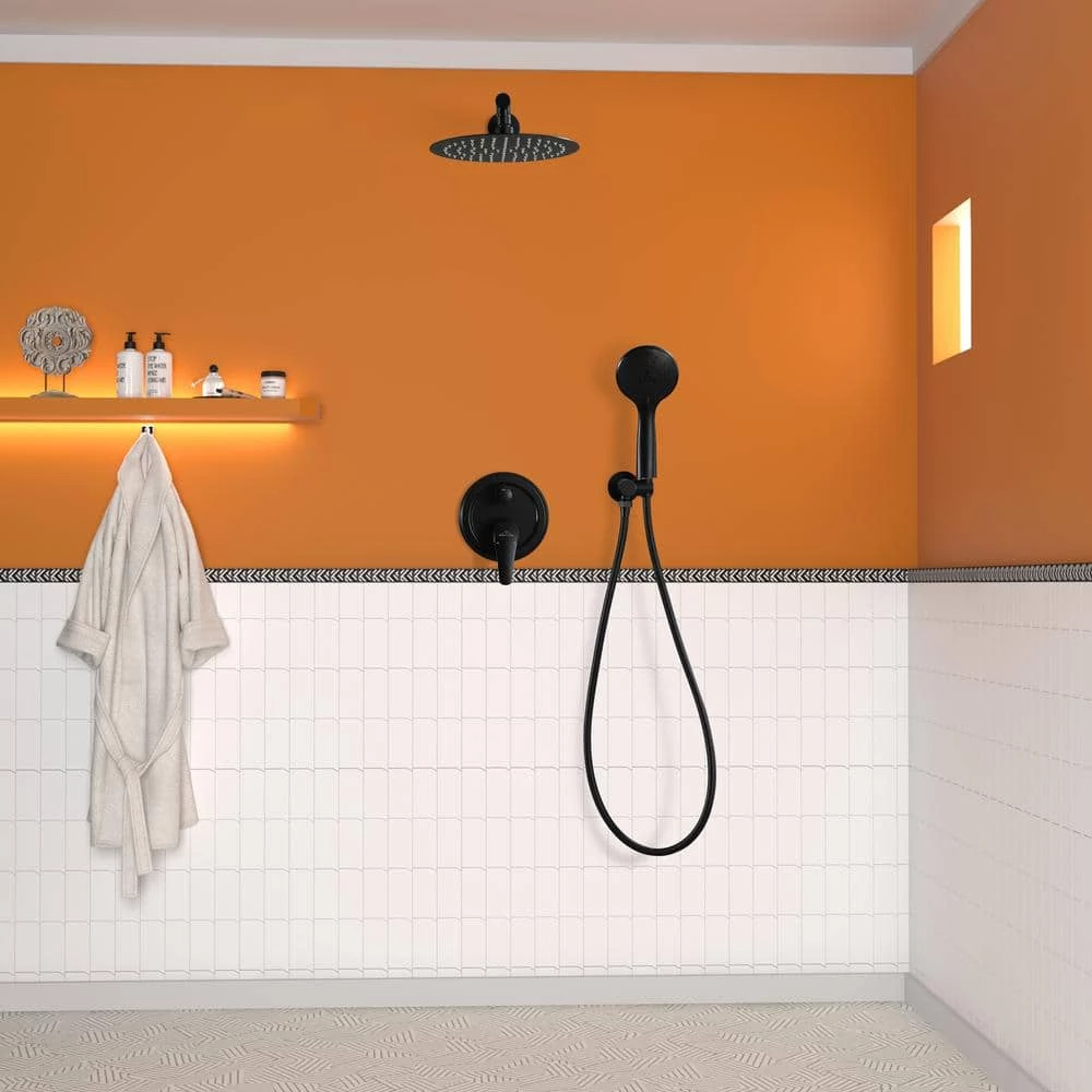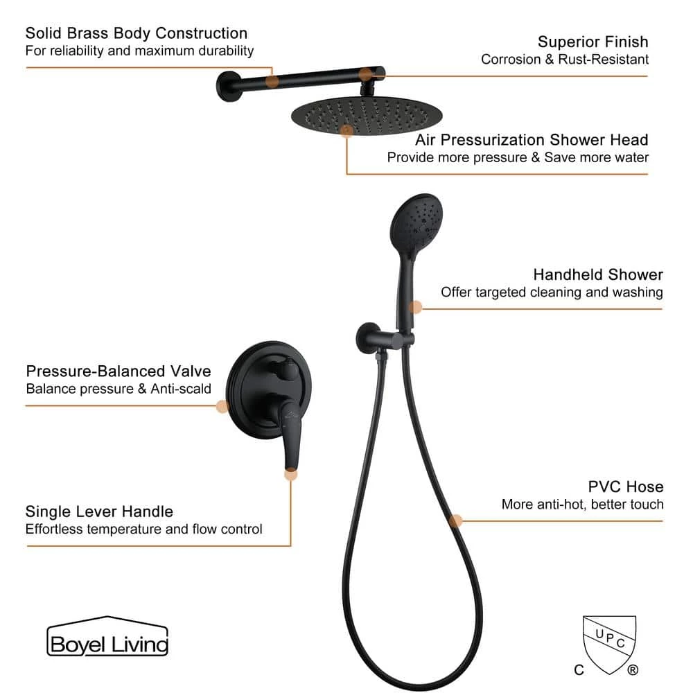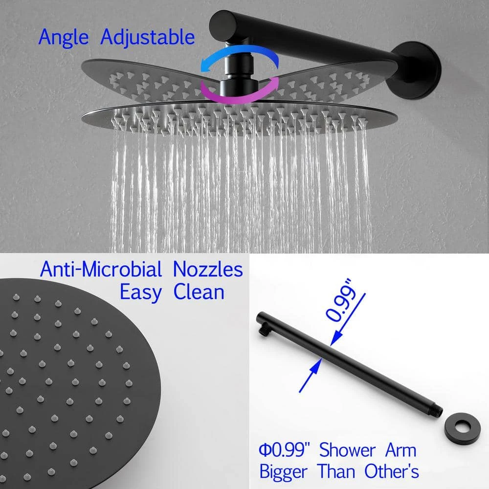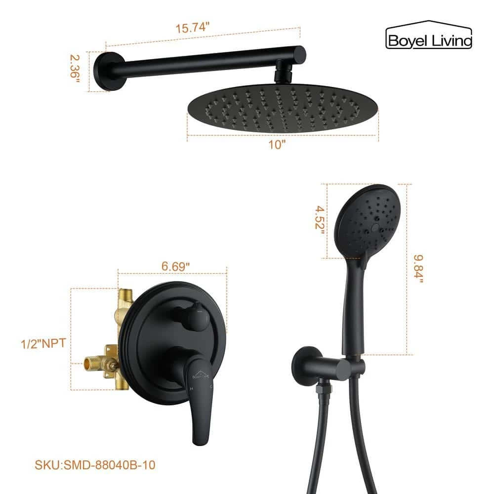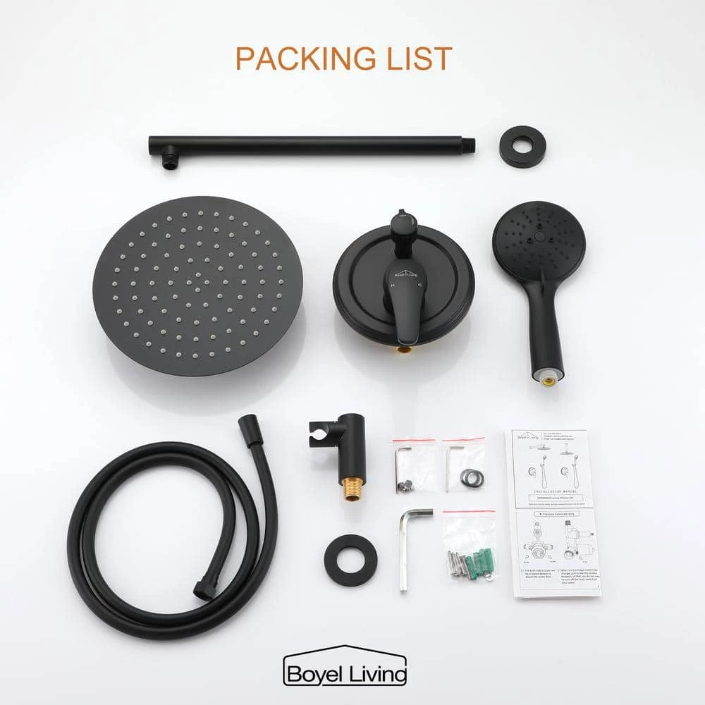 - Comes with premium solid brass shower valve, 10 in. rainfall shower head, 5-funtion hand shower, 59 in. shower hose, 15.7 in. extra-long shower arm, shower holder and other installation necessary parts.
