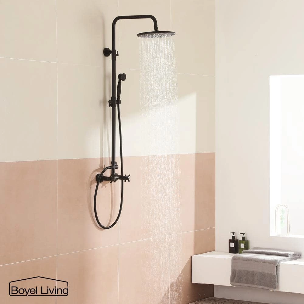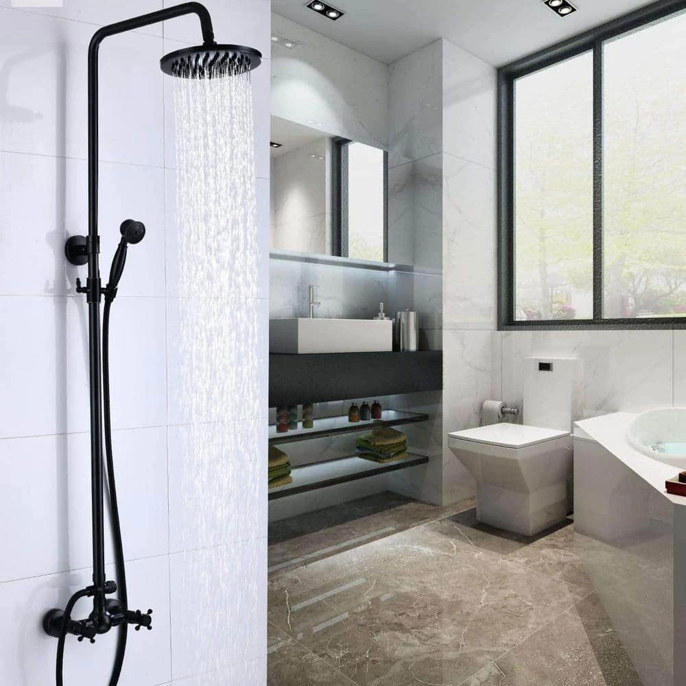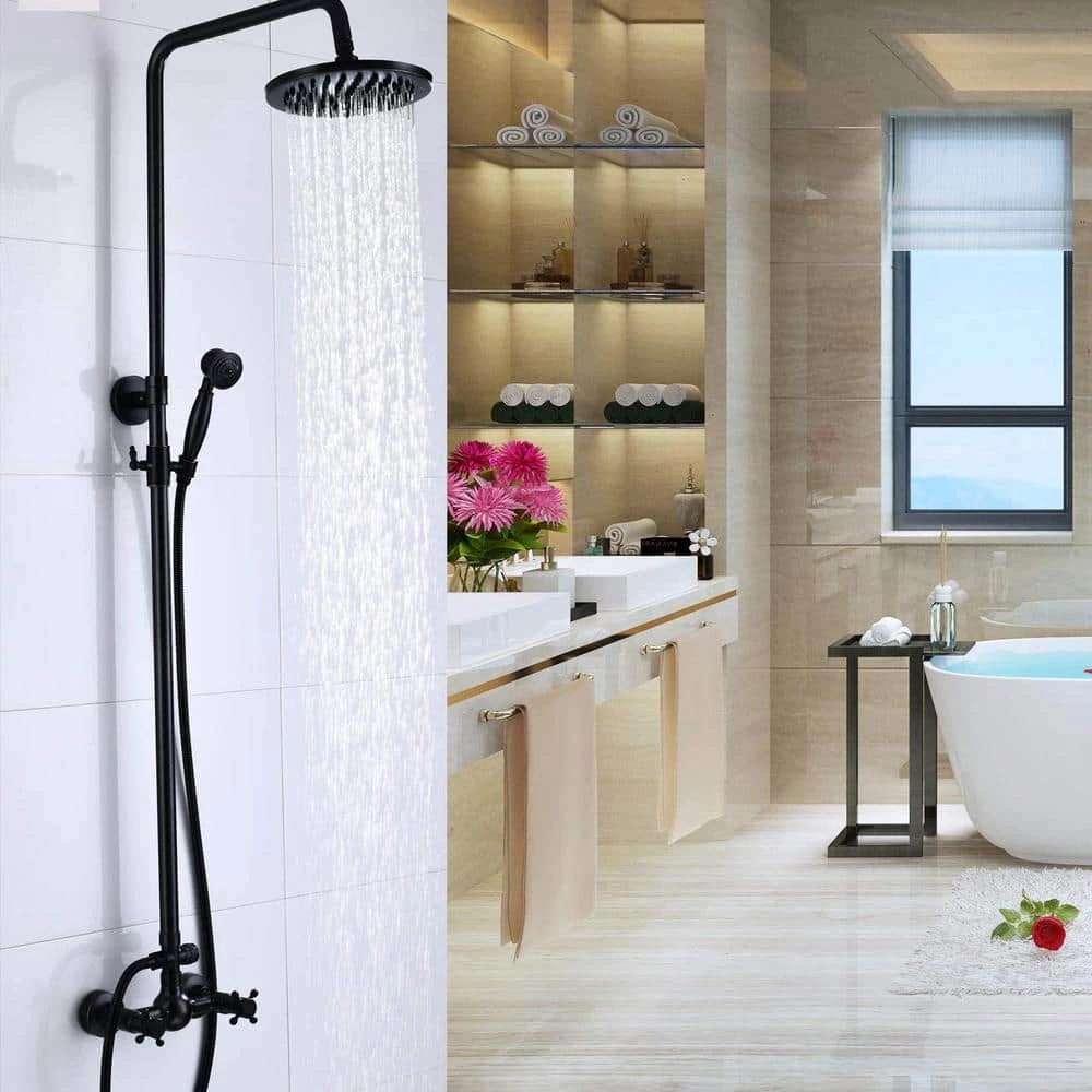 - [Dual Function]:Overhead rainfall shower and hand held spray. Solid brass diverter switches between top shower and hand spray. Simple and classic single handle shower faucet control hot and cold water.