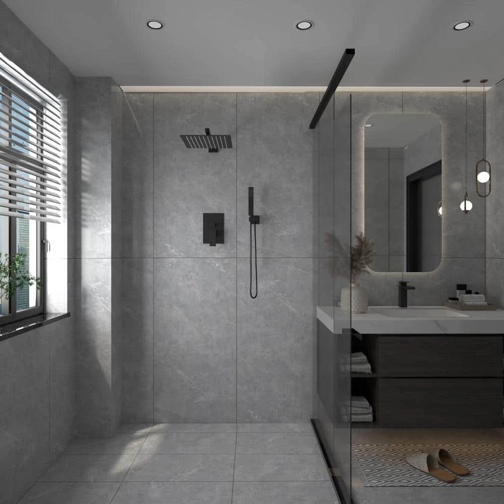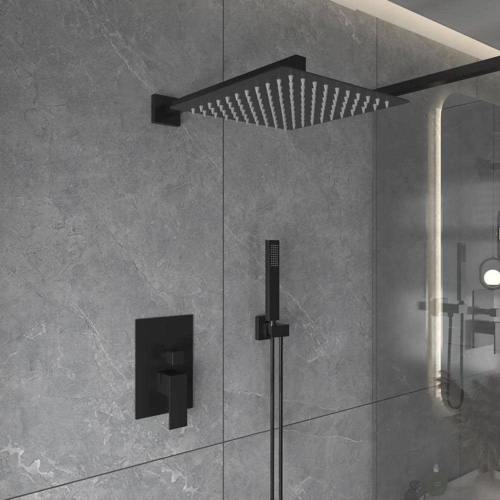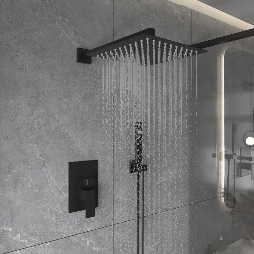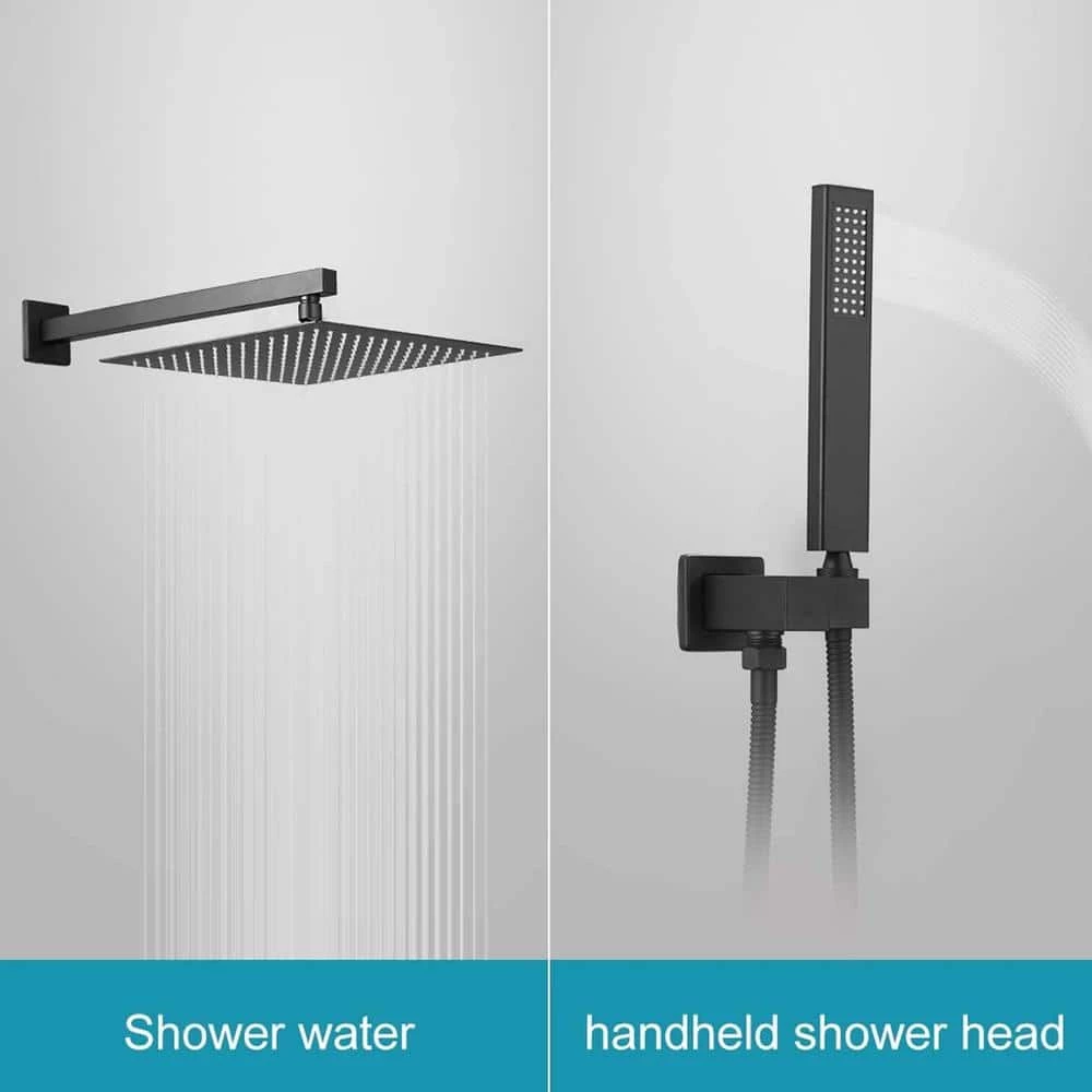 Charming and simplistic-BWE 12 in. square bathroom shower faucet combo set is a brilliant accessory for your bathroom. BWE always uses the best material to bring the best guarantee and quality to our customers. High air pressure technology inject the air into rain shower head to mix water with air offer more water pressure and giving you a pleasant shower.