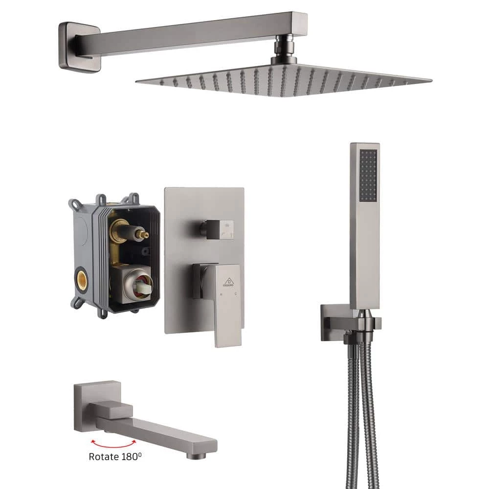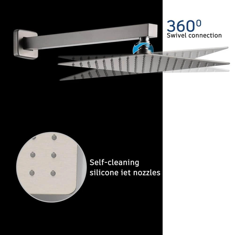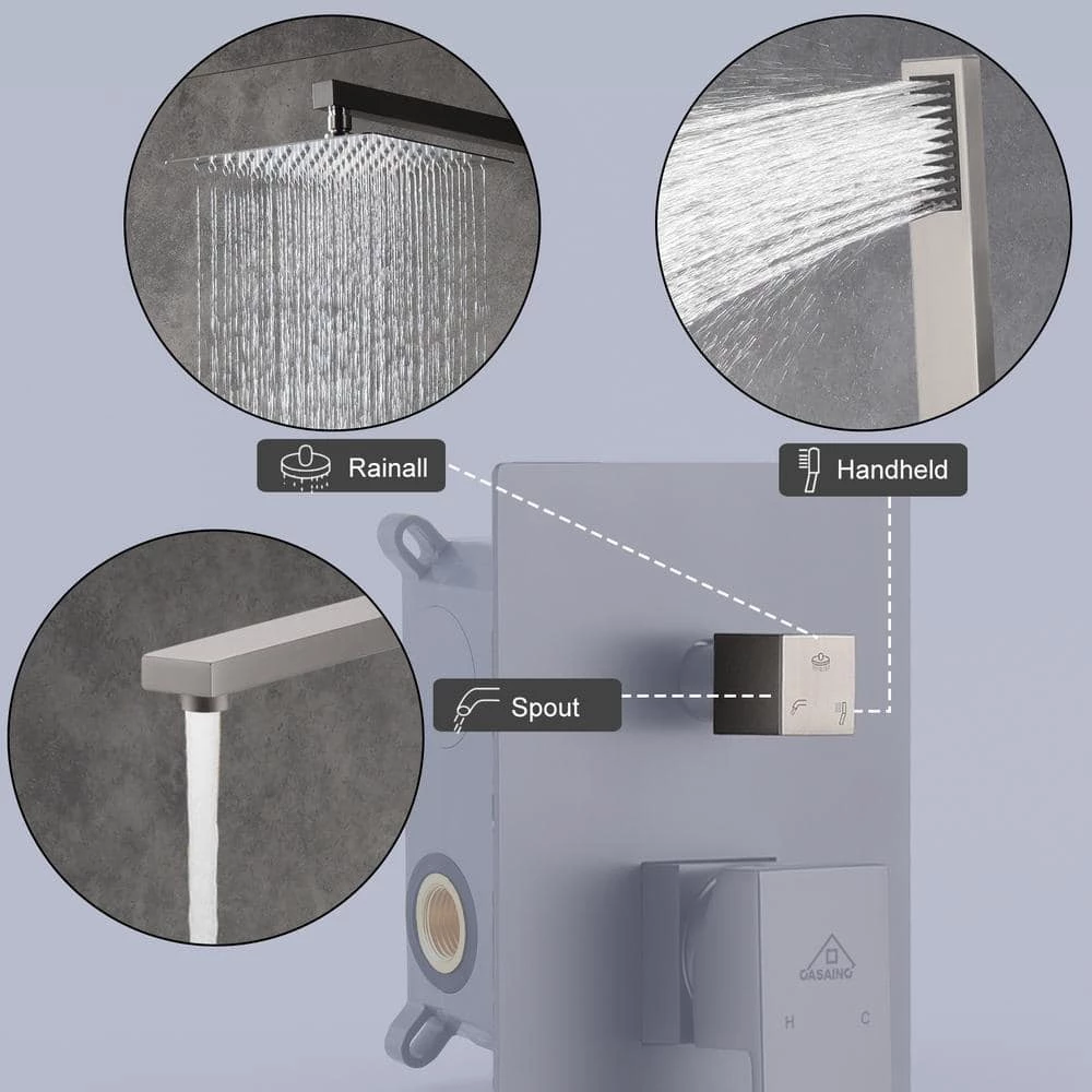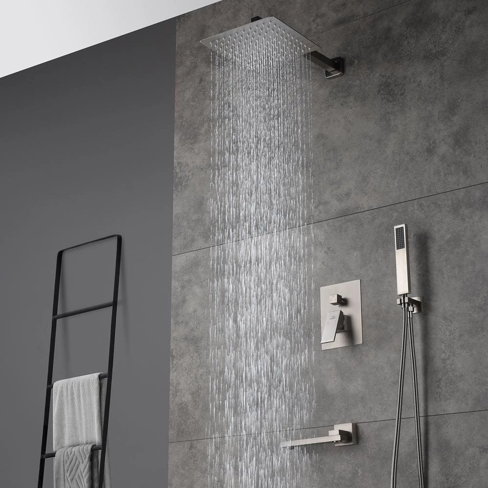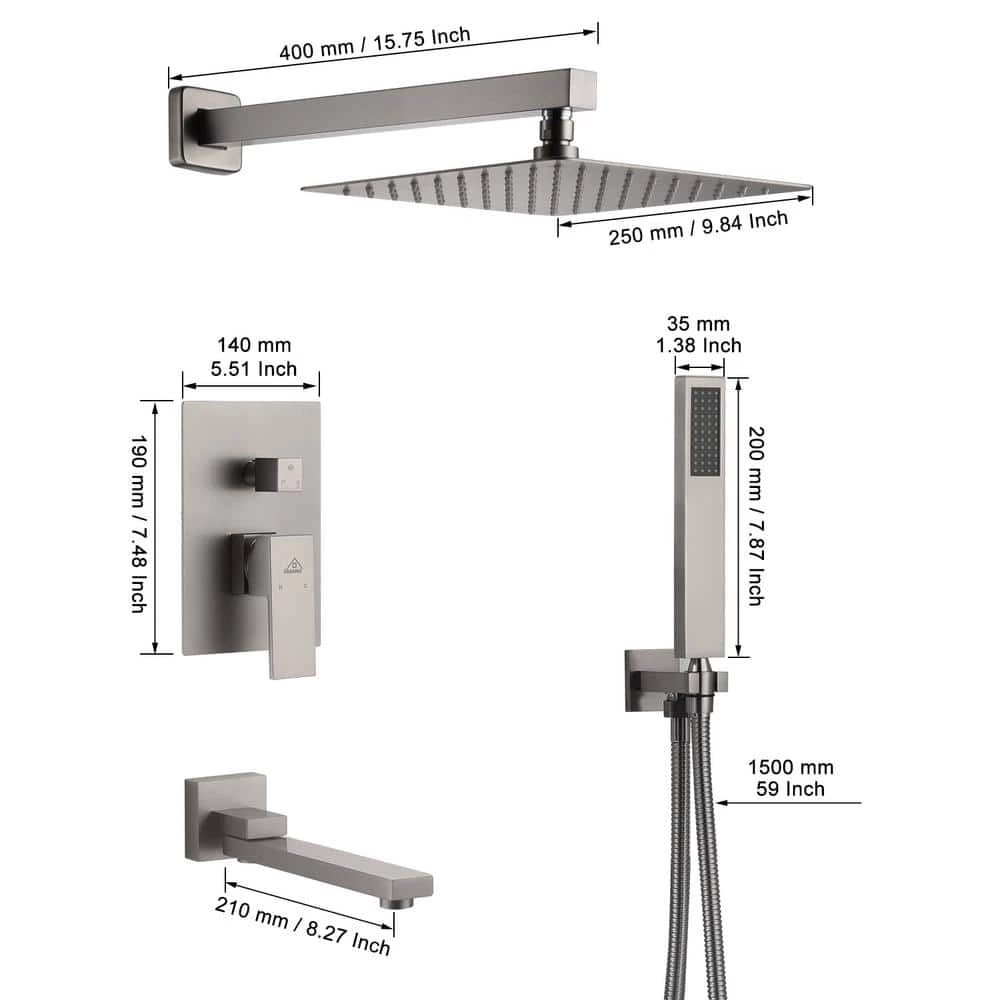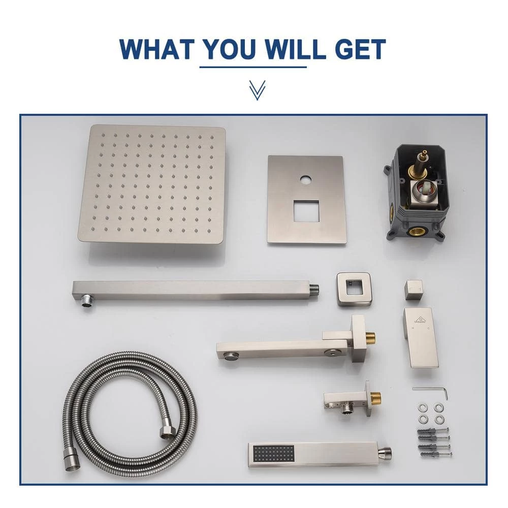 This wall-mounted 3-function brushed nickel single shower rain system is made of brass and the square stainless steel shower has a high-level appearance and long-lasting durability. CUPC certified valve, stainless steel hand shower with 59 in. hose and 15 in. shower arm. The whole set of shower system will bring you an advanced shower experience and wash away all-day fatigue.