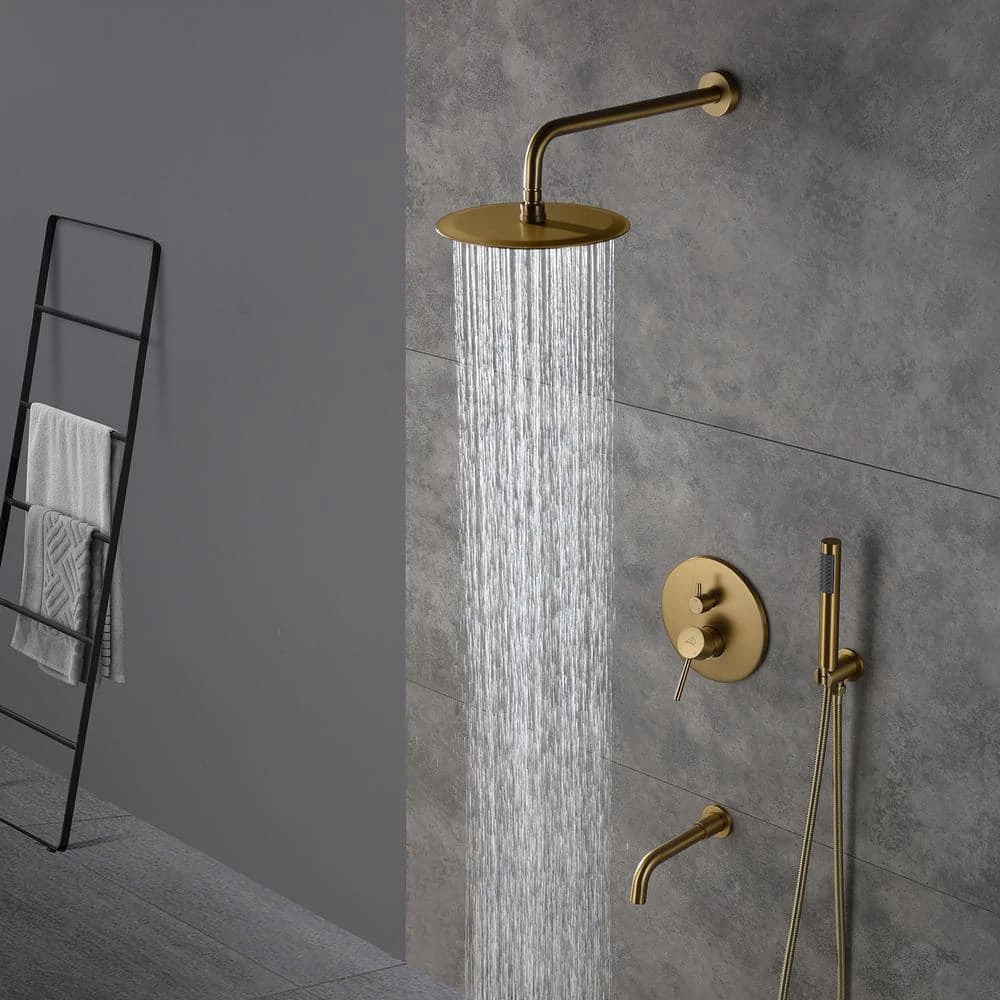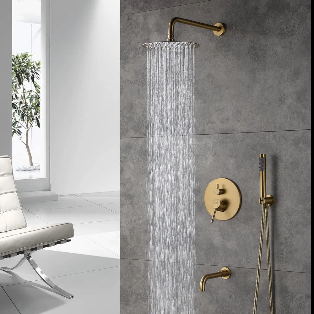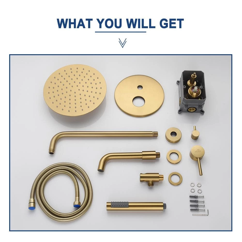 This wall-mounted 3-function circular shower system valve has passed CUPC certification. The round stainless steel shower head and the round 15-in. shower arm are curved. There is also a stainless steel hand shower, a 59-in. hose, and a brass bathtub spout. The whole set of shower system will bring you an advanced shower experience and wash away all-day fatigue.