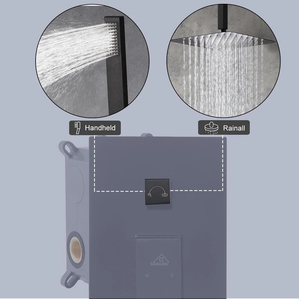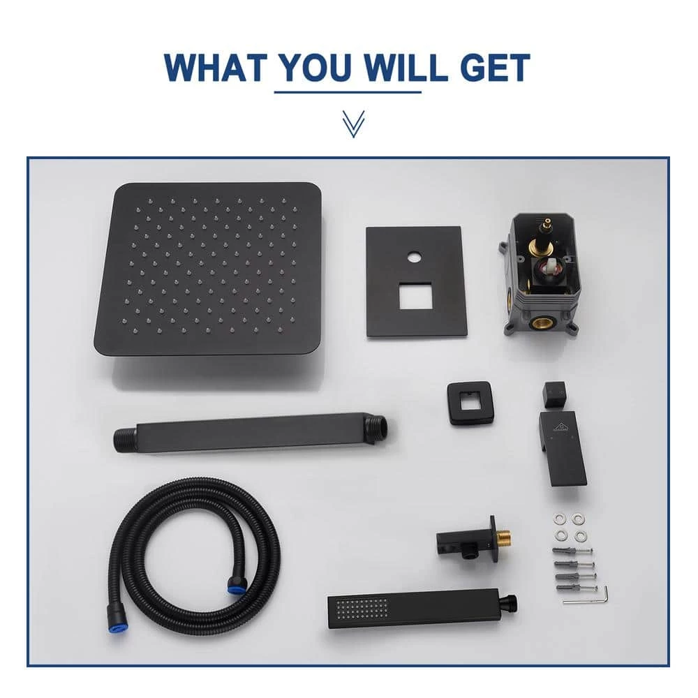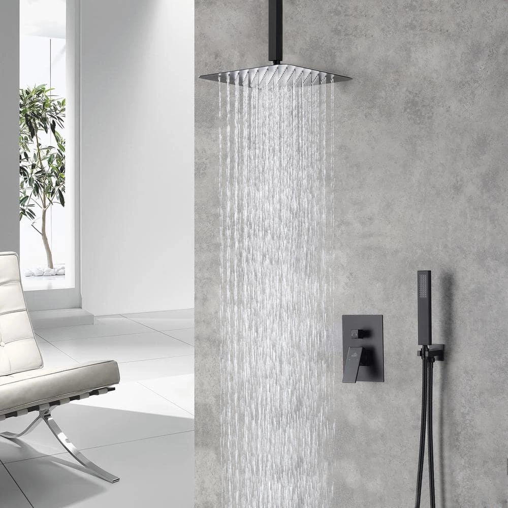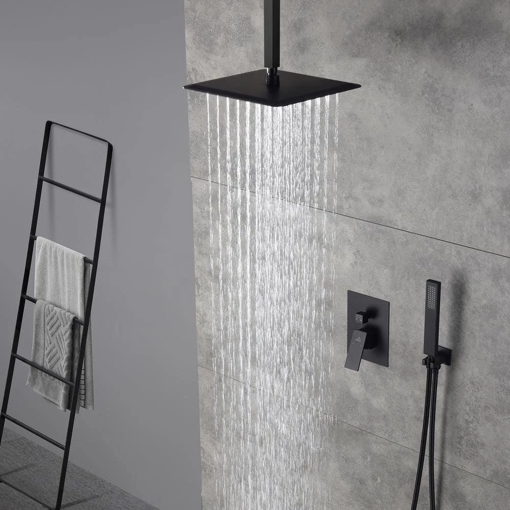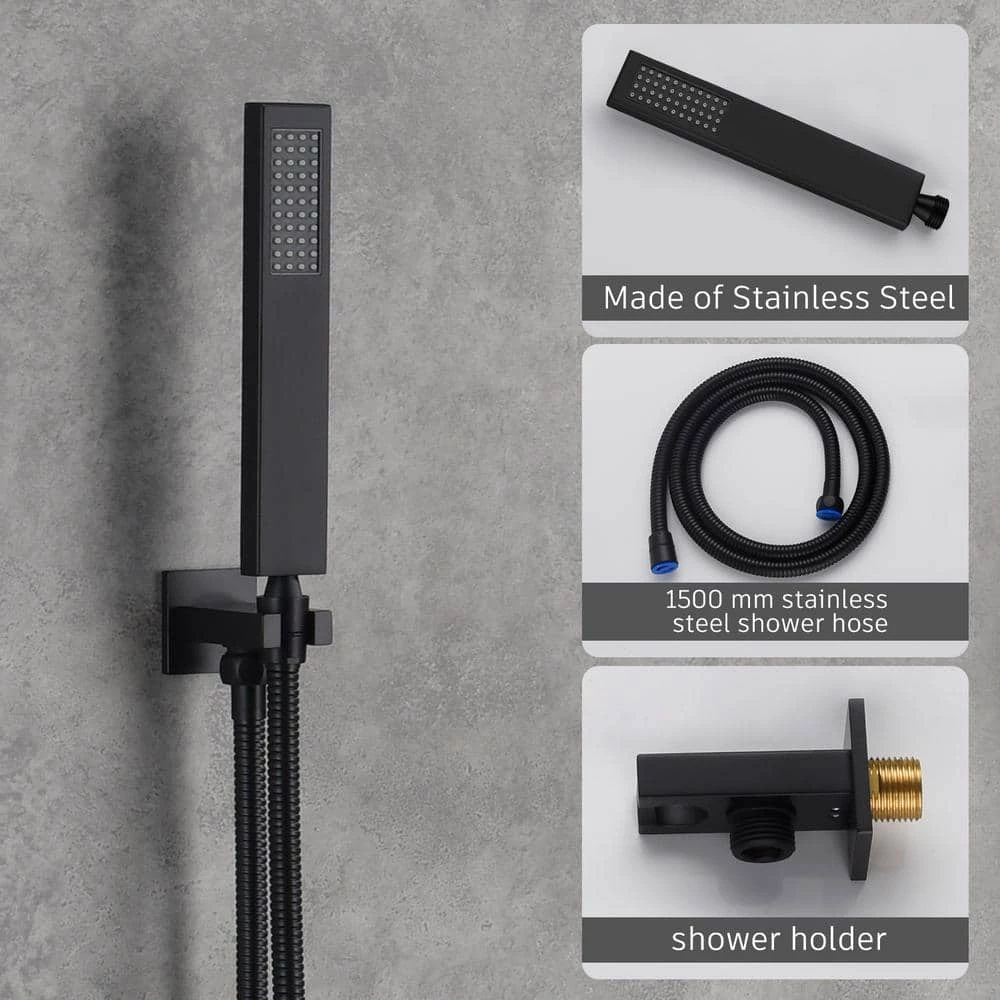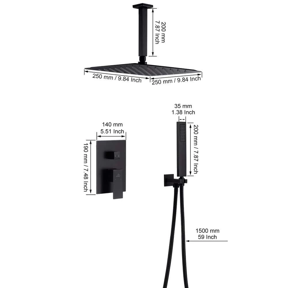 The main body of this ceiling mount matte black single shower rain system is made of brass, and the square stainless steel shower has a high-level appearance and long-lasting durability. CUPC certified valve ,Stainless steel hand shower with 59 in. hose and 15 in. shower arm. The whole set of shower system will bring you an advanced shower experience and wash away all-day fatigue.