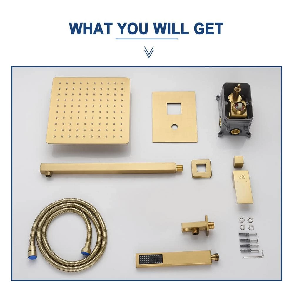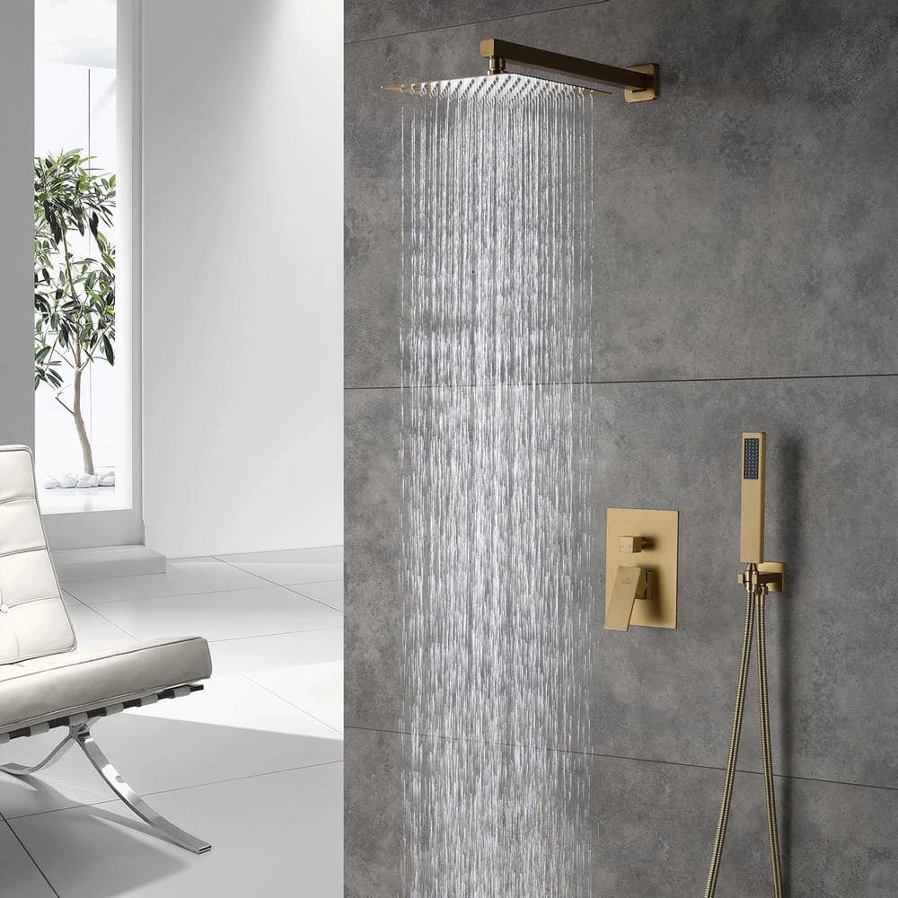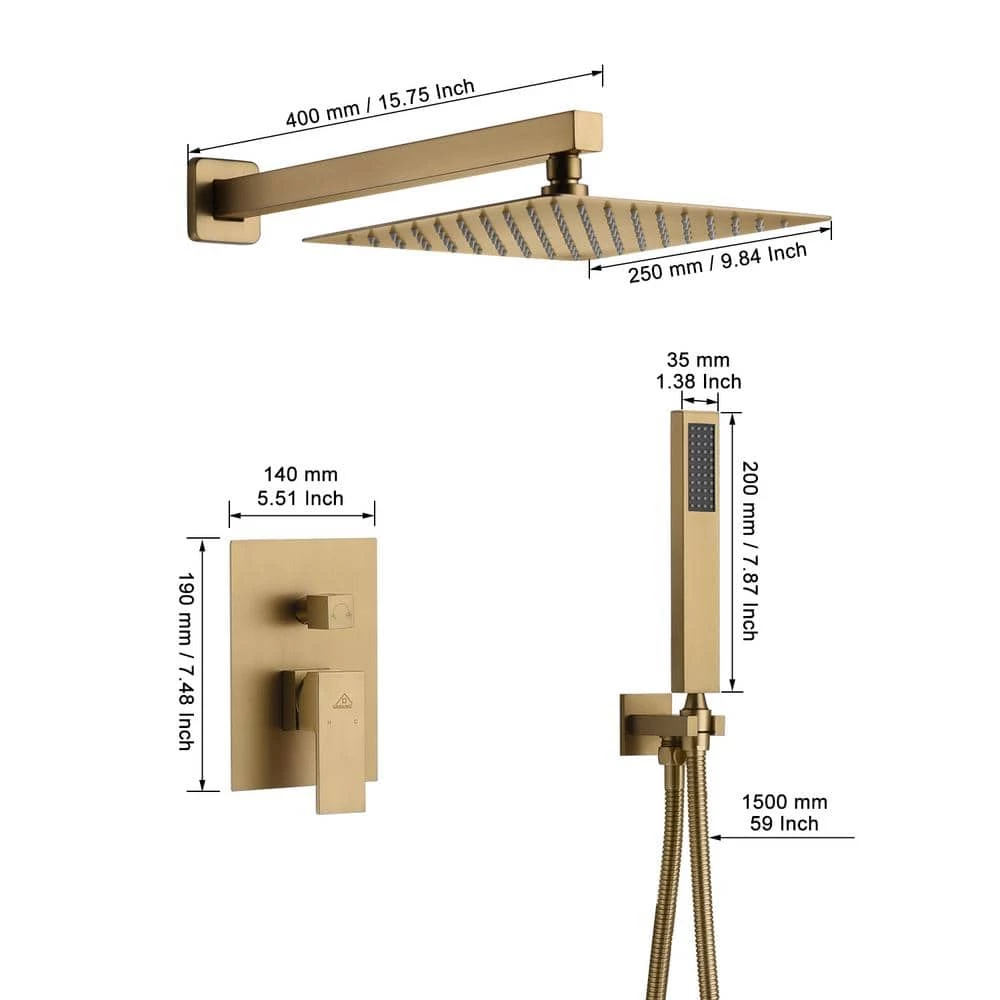 The main body of this brushed gold single shower rain system is made of brass, and the square stainless steel shower has a high-level appearance and long-lasting durability. CUPC certified valve ,Stainless steel hand shower with 59 in. hose and 15 in. shower arm. The whole set of shower system will bring you an advanced shower experience and wash away all-day fatigue.
