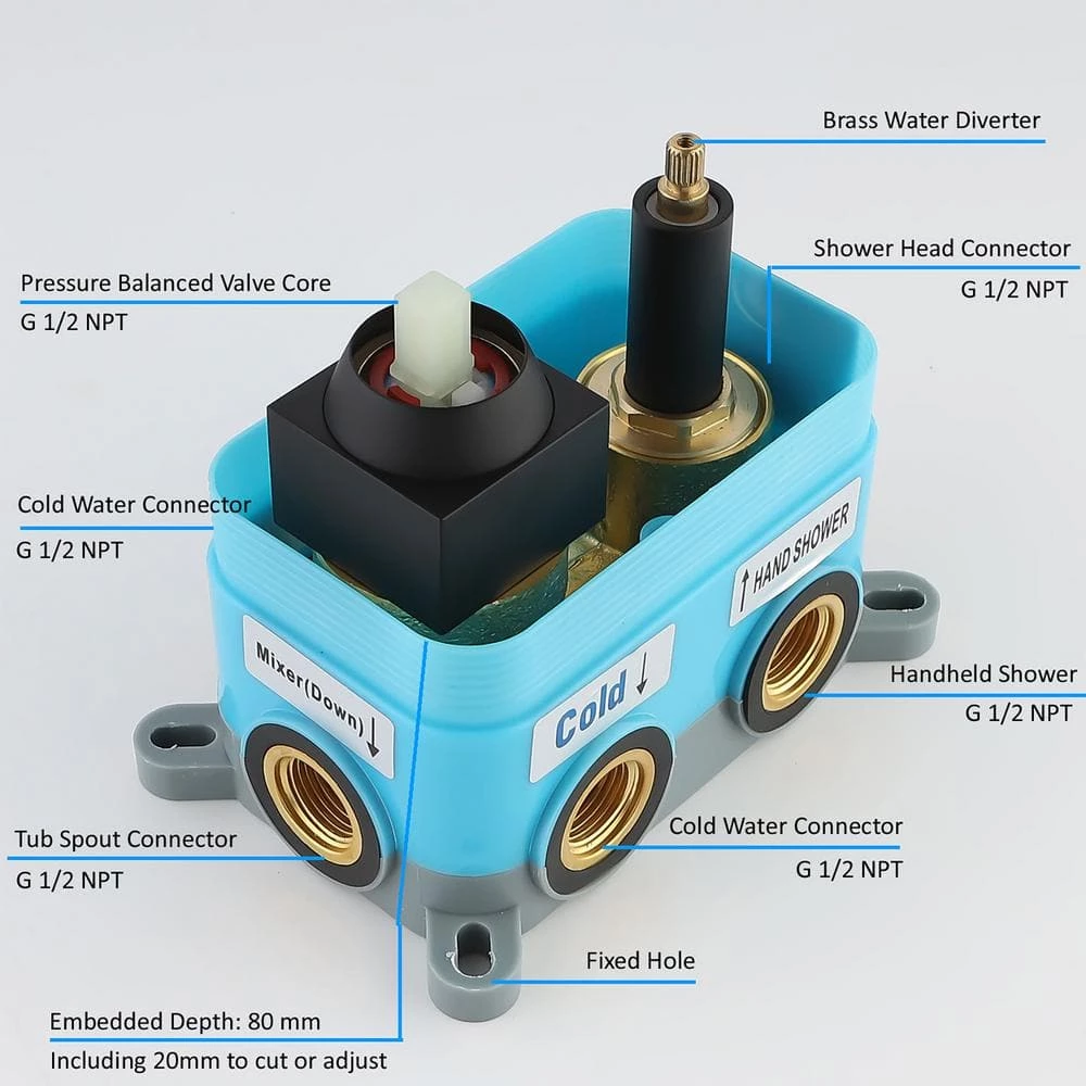 - Pressure Balanced Valve with CUPC Certification: The pressure balanced valve protects you from any hurts of sudden water temperature change. The additional shut-off stop would help you adjust water flow and convenient maintenance.