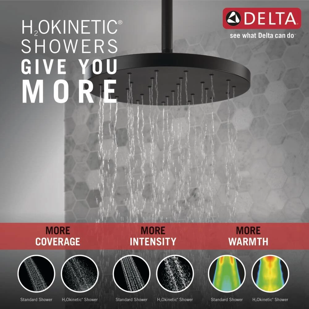 - H2Okinetic shower technology sculpts water into a unique pattern, forming a powerful drench spray