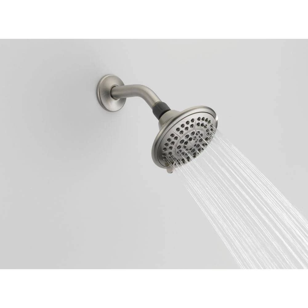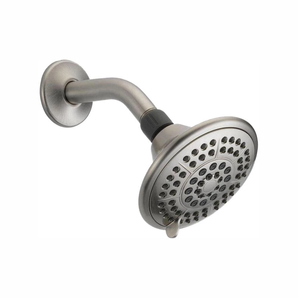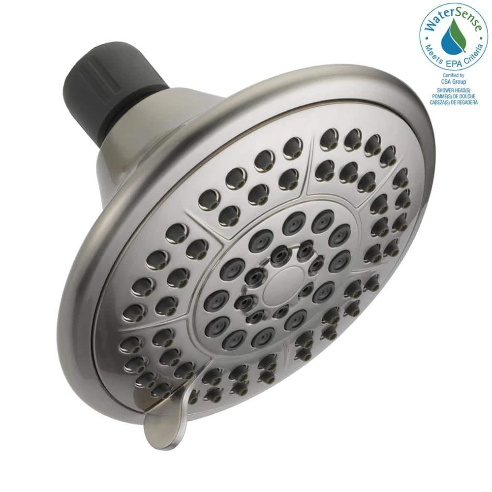This 5-Spray Shower Head in Brushed Nickel with Pause is a simple and easy way to update the look and functionality of your bath. The 5-way spray dial to select the setting is easy to use. Stainless-plated face creates a seamless look. For quick removal of mineral deposits, simply wet the rub-clean nozzles rub and rinse away.