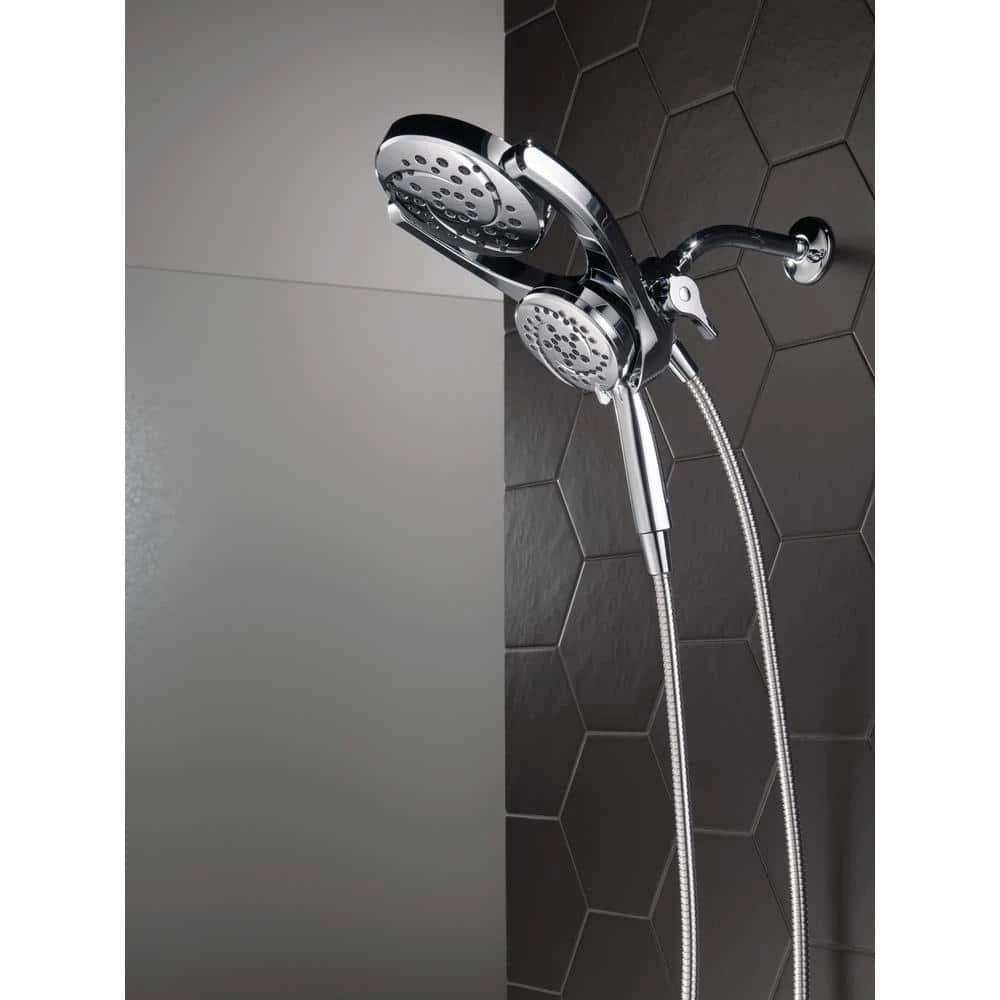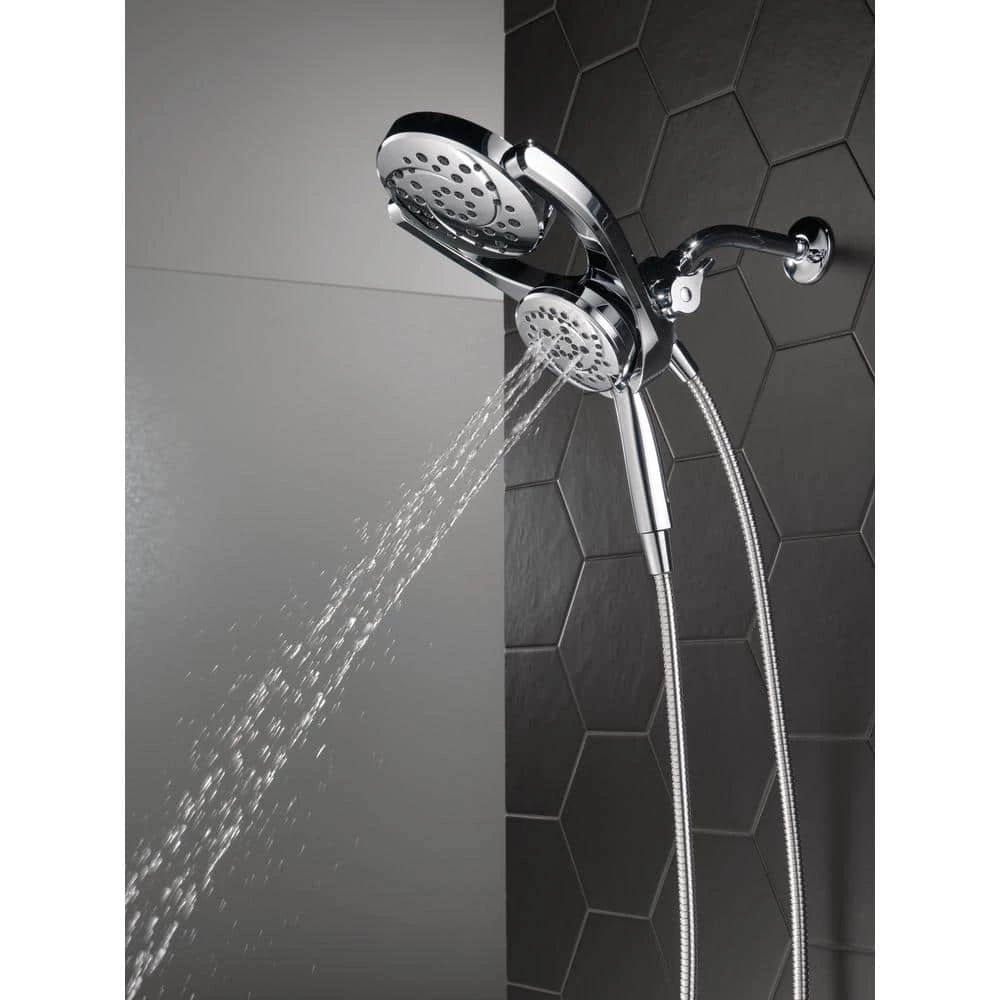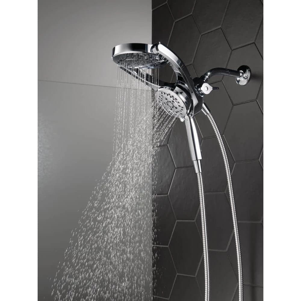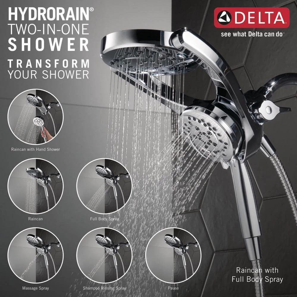 Designed to fit a standard shower arm, the HydroRain Two-in-One Shower Head with Hand Shower installs in minutes. Once installed, it provides you with a luxurious shower experience and complete control over your water with a pivoting rain can and the option to use the rain can on its own, the hand shower on its own, or both together. While other products may gather unsightly mineral build-up over time, Delta soft rubber Touch-Clean spray holes allow any mineral residue to simply be wiped away for an instantly refreshed look with no need for soaking or the aid of chemical cleaners. The pause setting gives you ample space for shaving, lathering and other shower tasks, without worrying about overspray or water waste. This spray setting helps you conserve water, so you can worry less about depleting your supply of hot water – and you help the environment too. Delta Water Sense labeled faucets, showers and toilets use at least 20% less water than the industry standard saving you money without compromising performance.