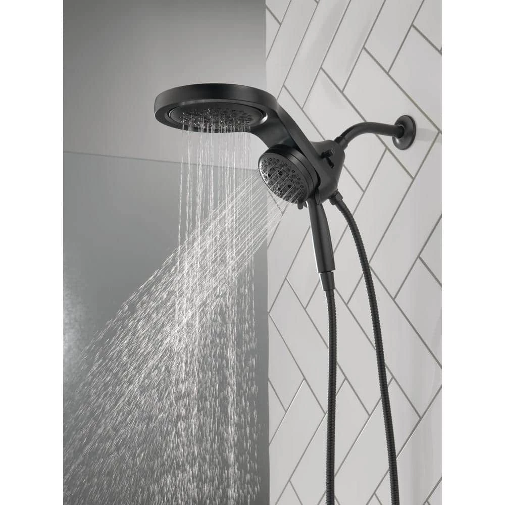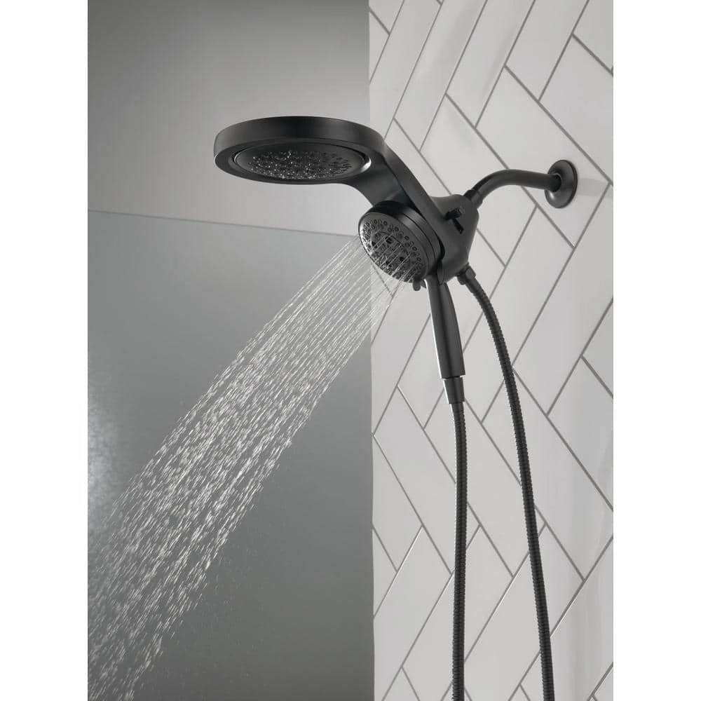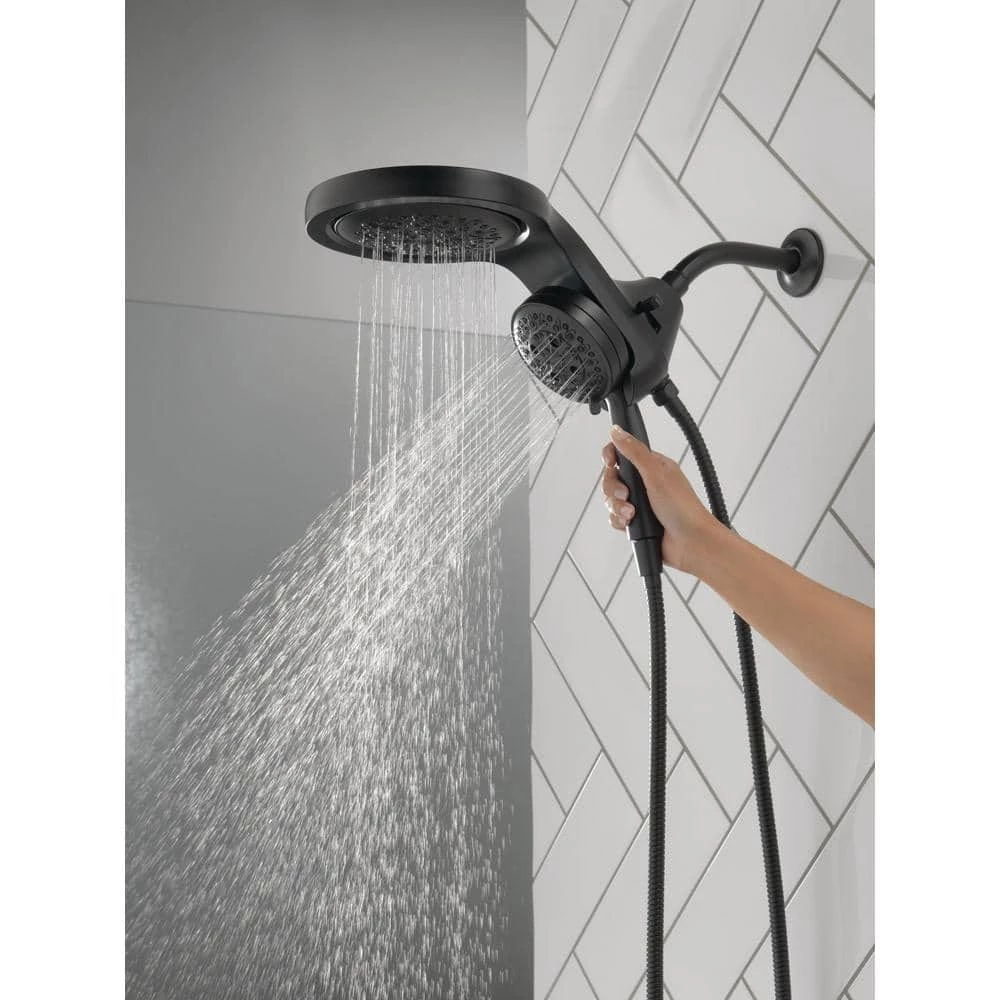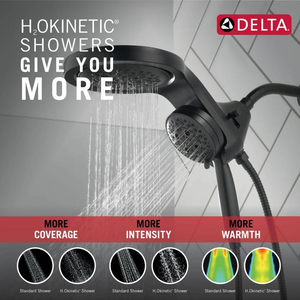 A Delta HydroRain H2Okinetic 2-in-1 Shower Head with hand shower completely transforms your shower with dual shower head functionality, featuring an integrated rain can and hand shower. The power of the rain can and hand shower together creates an immersive, spa-like showering experience that you can install in minutes to a standard shower arm, without altering the plumbing behind the wall. The integrated hand shower stays put every time you dock thanks to MagnaTite Docking and provides maximum flexibility and control when you need it, while the H2Okinetic PowerDrench Spray feels like more water, warmth and intensity without using more water. Don’t just take a shower, transform it, with a Delta HydroRain Shower Head. While other products may gather unsightly mineral build-up over time, Delta soft rubber Touch-Clean spray holes allow any mineral residue to simply be wiped away for an instantly refreshed look with no need for soaking or the aid of chemical cleaners. The pause setting gives you ample space for shaving, lathering and other shower tasks, without worrying about overspray or water waste. This spray setting helps you conserve water, so you can worry less about depleting your supply of hot water – and you help the environment too. Delta WaterSense labeled faucets, showers and toilets use at least 20% less water than the industry standard saving you money without compromising performance.