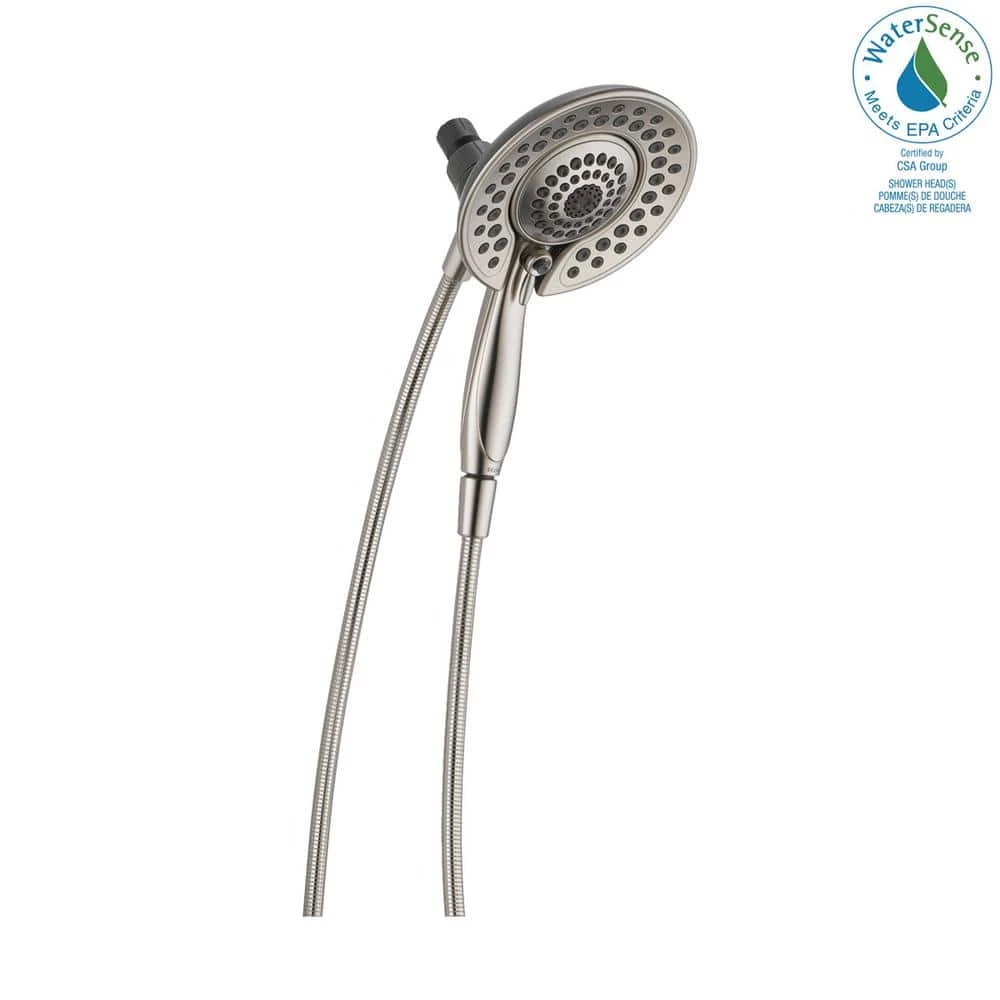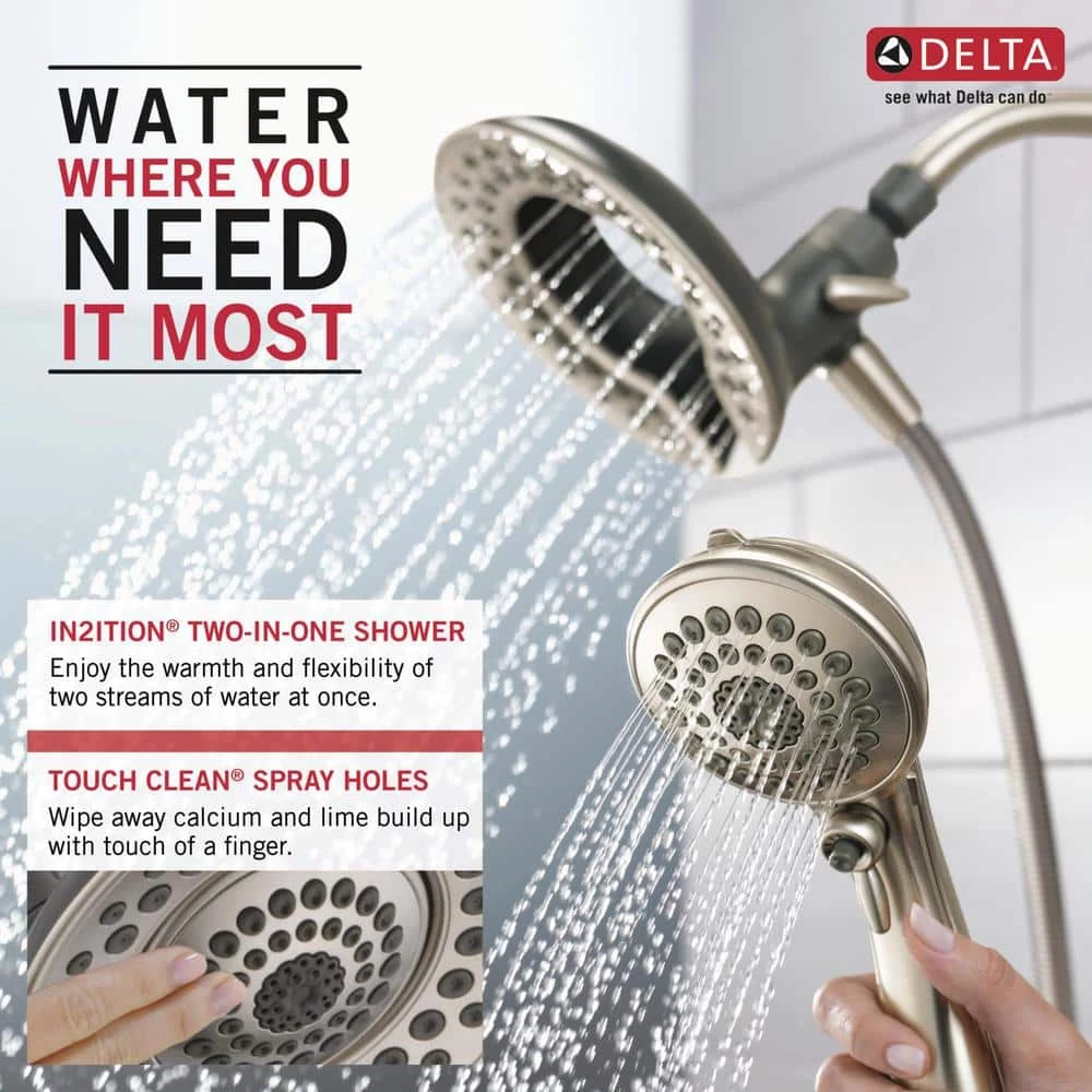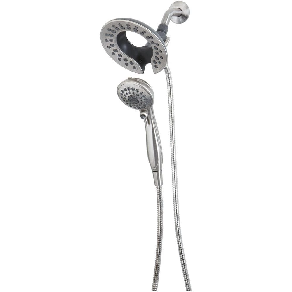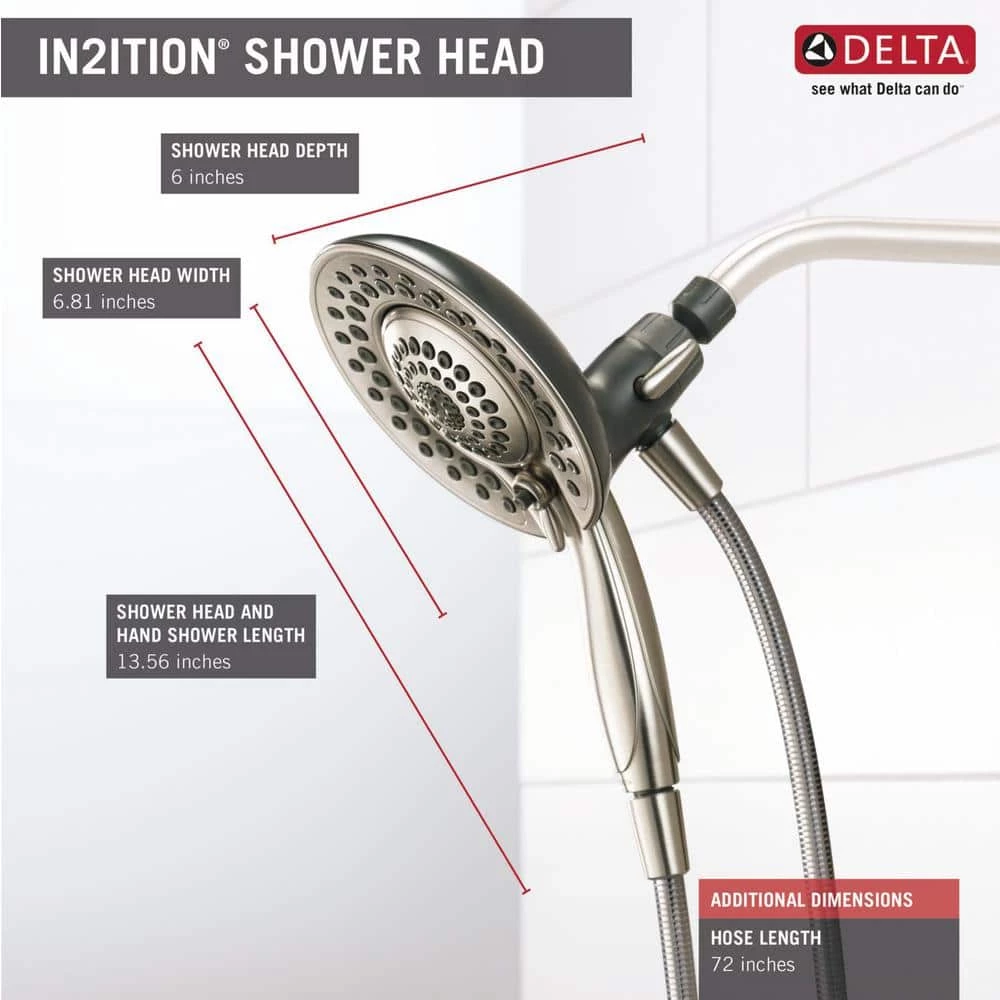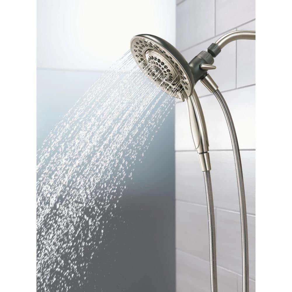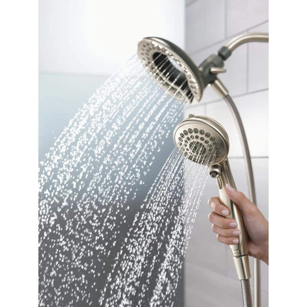 The In2ition 5-Function Hand Shower and Shower Head Combo Kit in Brushed Nickel is a simple and convenient way to update the look and functionality of your bath. The easy-to-use, 3-way diverter lets you choose to operate either the hand shower, shower head or both at 1 time, while the matching plated face and push-button pause control create a seamless look. You’ll have great range of motion with the 6 ft. flexible hose, great for hard-to-reach spots or for bathing kids and pets. This extra-wide, full-spray Shower Head features 5 spray settings including massage, designed for a personalized shower every time.
