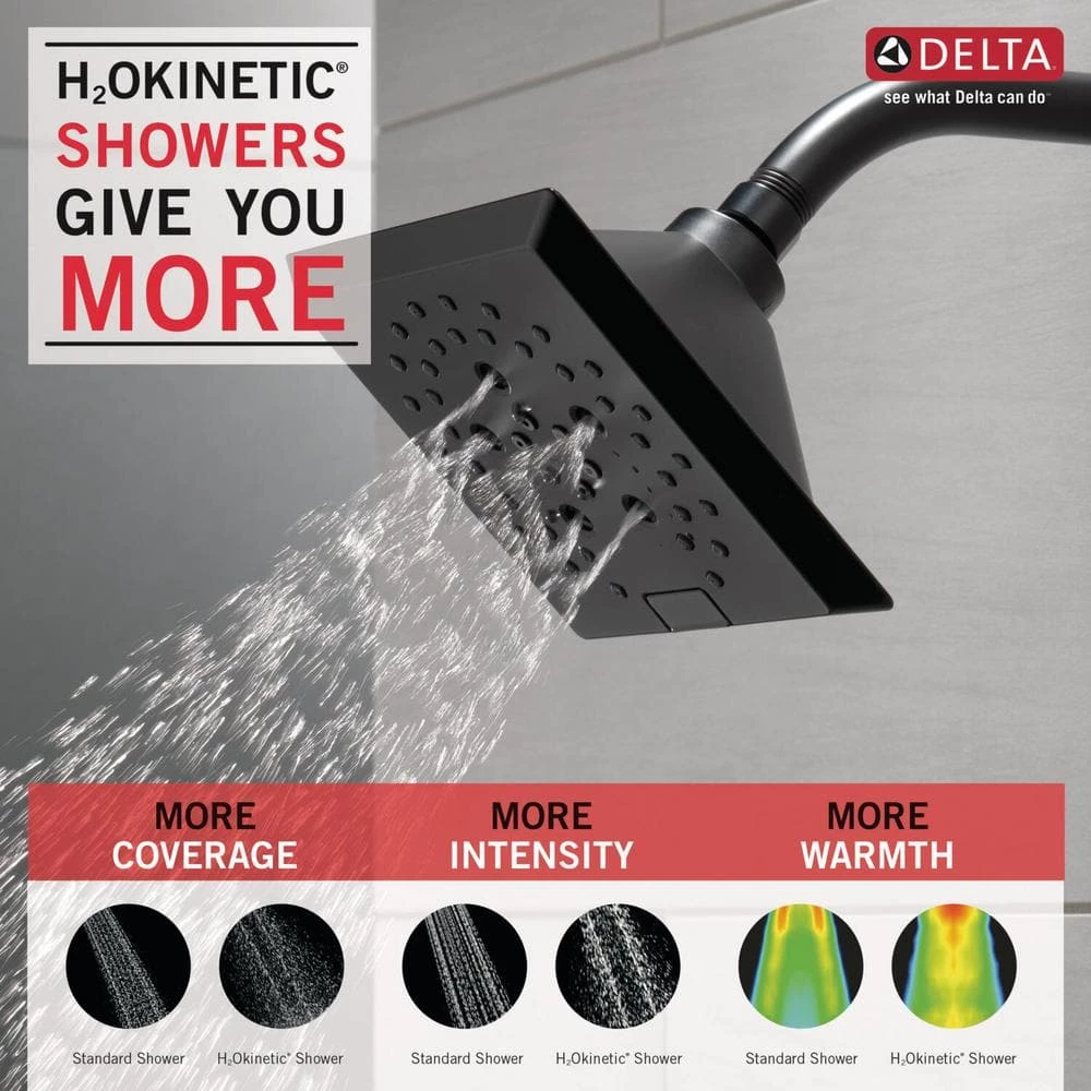 Delta H2Okinetic PowerDrench Showers look different because they are different. H2Okinetic showers are powered by an innovative technology that sculpts the water into a unique wave pattern, giving you the feeling of more water without using more water and creating a shower with more warmth, coverage and intensity. So go ahead and indulge, because now you can enjoy the feeling of more water without using more water. Replacing your shower head is one of the quickest, simplest upgrades you can make to your shower. Our shower heads feature a wide range of styles and innovations, and install in less than 20 minutes – no special tools required. While other products may gather unsightly mineral build-up over time, Delta soft rubber Touch-Clean spray holes allow any mineral residue to simply be wiped away for an instantly refreshed look with no need for soaking or the aid of chemical cleaners. The pause setting gives you ample space for shaving, lathering and other shower tasks, then easily restarts the water with the temperature where you left off. This spray setting helps you conserve water, so you can worry less about depleting your supply of hot water – and you help the environment too. Delta WaterSense labeled faucets, showers and toilets use at least 20% less water than the industry standard saving you money without compromising performance.