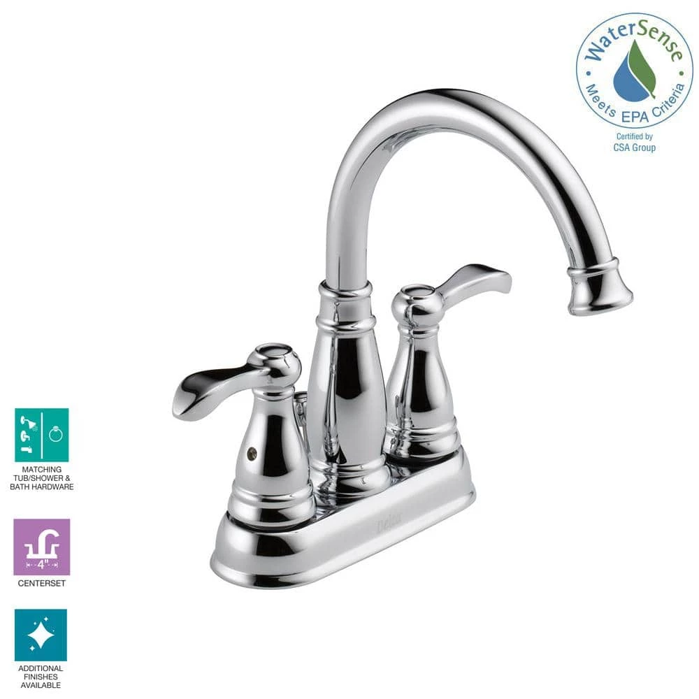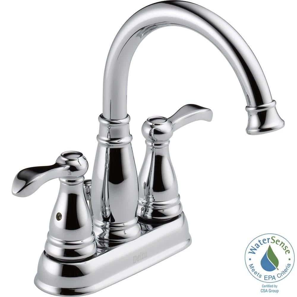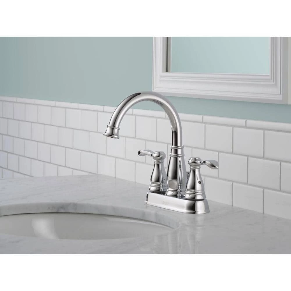 The Porter Center set 2-Handle High-Arc Bathroom Faucet from Delta features a bright, clean appearance to enhance any bath decor. 2 lever handles are designed to make water flow and temperature adjustments easy, while the spout features a 7 in. tall arc with a long reach right into the basin, providing ample space for washing. This eco-friendly design is also WaterSense certified, designed to efficiently promote water conservation with its 1.5 GPM flow rate.