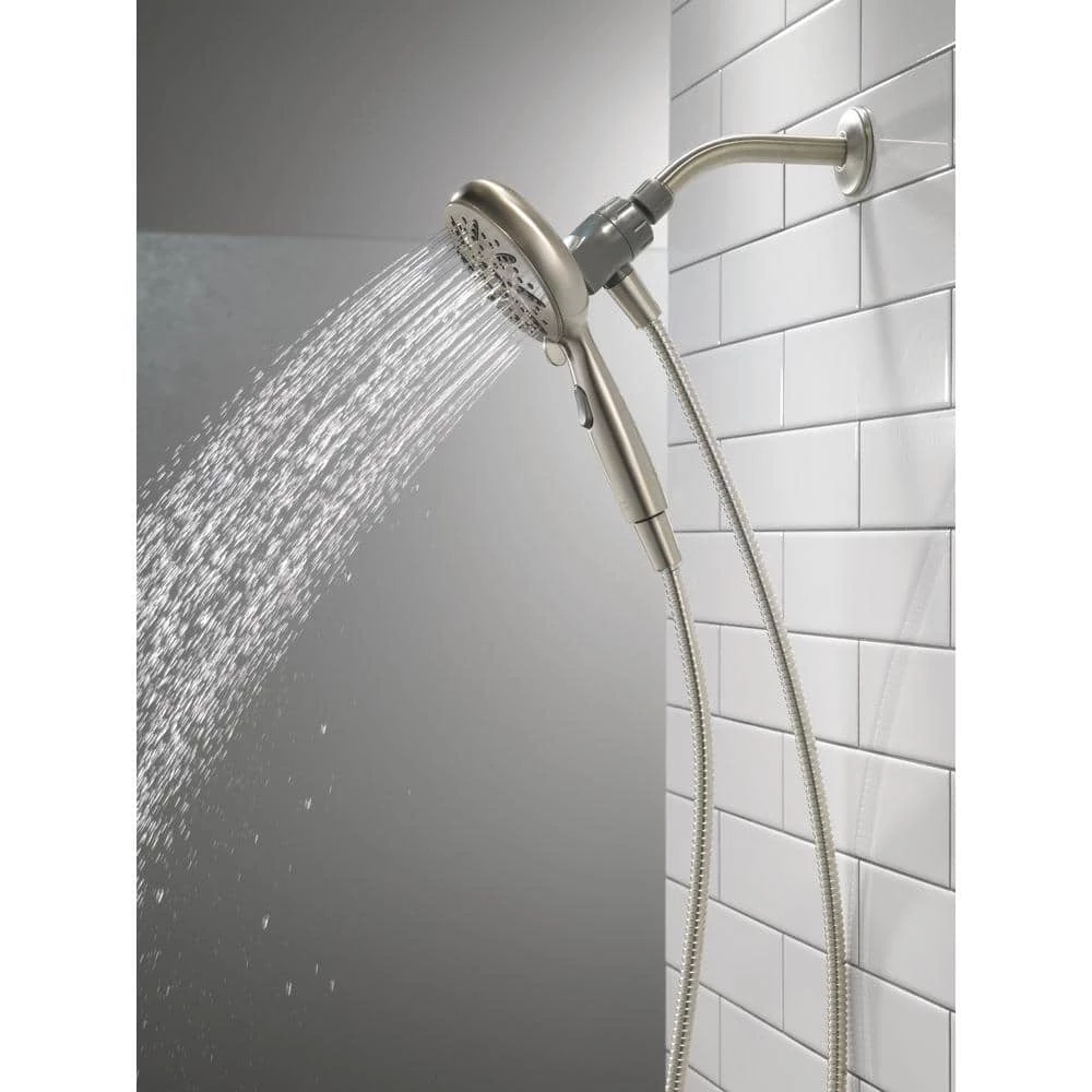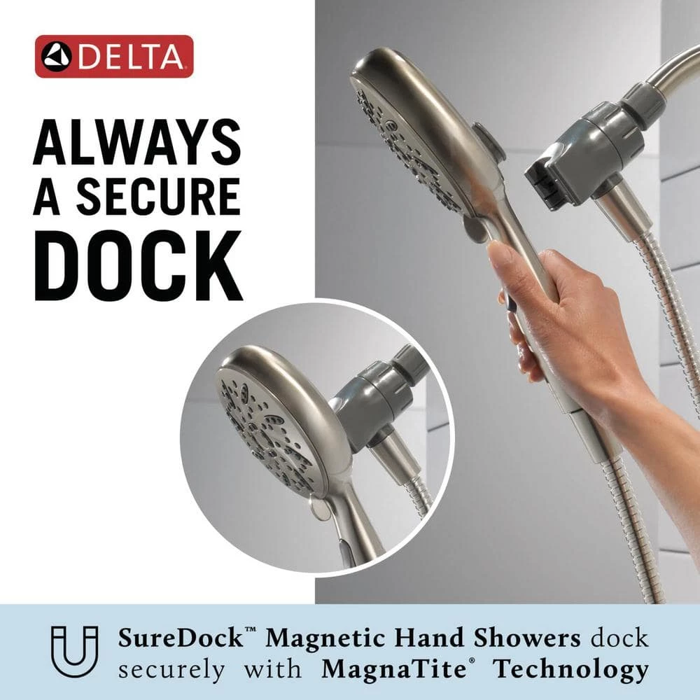 Experience a better shower with the control and flexibility of a Delta hand shower. Great for showering yourself or your loved ones and pets, as well as for keeping your shower and tub clean. SureDock Magnetic Hand Showers bring reliable docking within reach. An integrated magnet on the back of the hand shower snaps your hand shower into place and holds it there, so it stays docked when not in use and doesn’t droop over time. While other products may gather unsightly mineral build-up over time, Delta soft rubber Touch-Clean spray holes allow any mineral residue to simply be wiped away for an instantly refreshed look with no need for soaking or the aid of chemical cleaners. The pause setting gives you ample space for shaving, lathering and other shower tasks, without worrying about overspray or water waste. This spray setting helps you conserve water, so you can worry less about depleting your supply of hot water and you help the environment too. Delta WaterSense labeled faucets, showers and toilets use at least 20% less water than the industry standard saving you money without compromising performance.