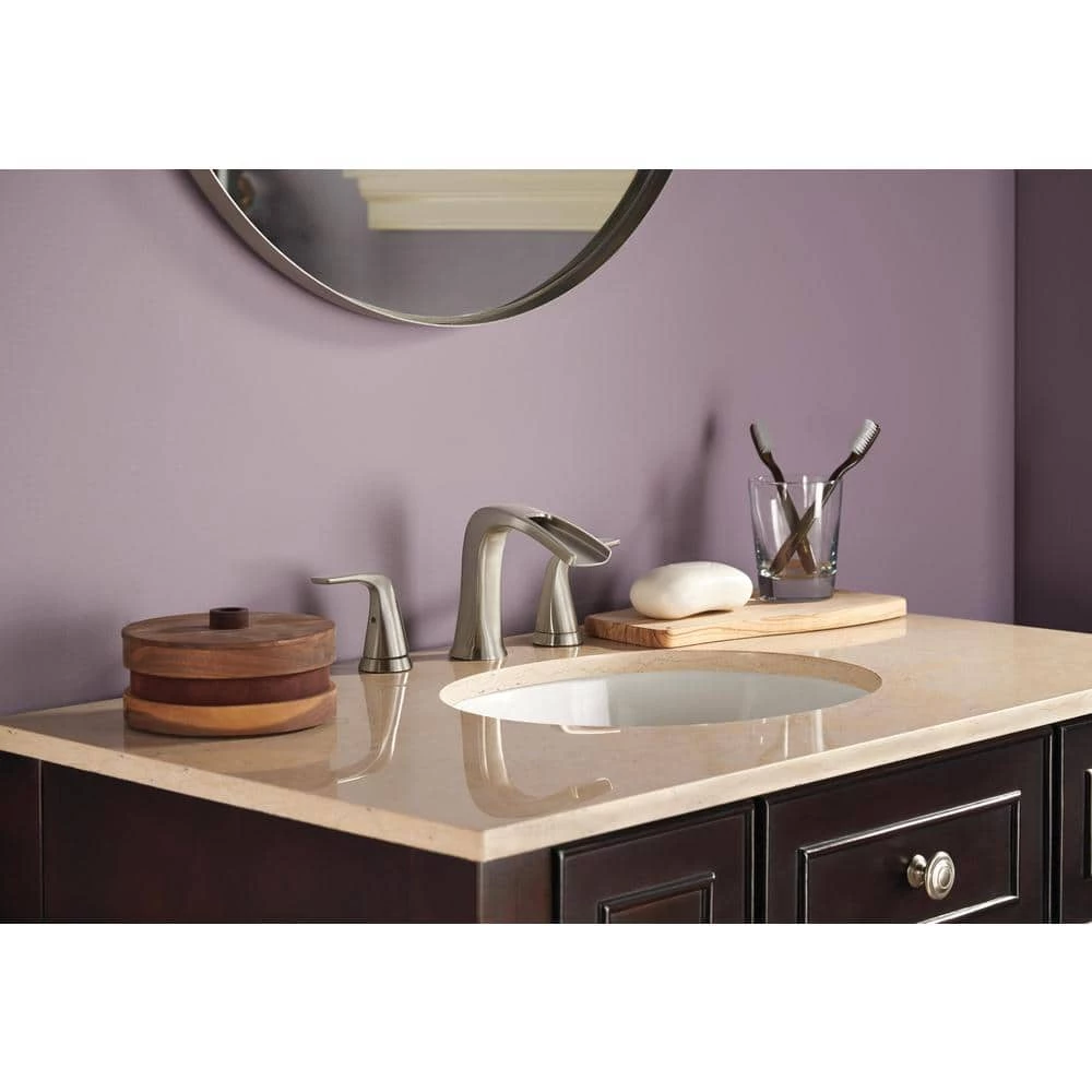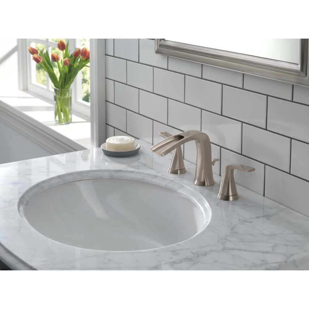Elegant and enduring, the Tolva 8 in. Widespread 2-Handle Bathroom Faucet in Brushed Nickel blends modern sensibility with Delta durability to create a sleek, sophisticated style. Its high-arc spout allows for plenty of clearance for washing hands, while a smooth brushed nickel finish makes it easy to clean and maintain the striking appearance. This environmentally friendly design is also WaterSense certified to reduce water waste, making it an efficient and responsible choice for your home.
