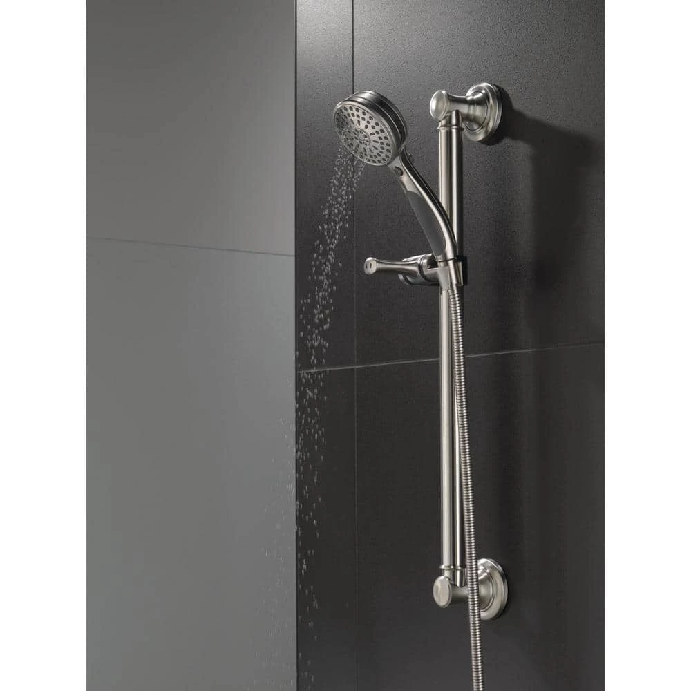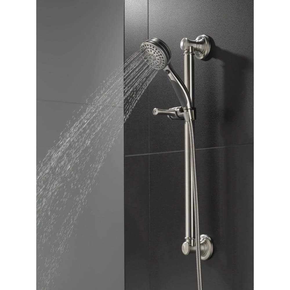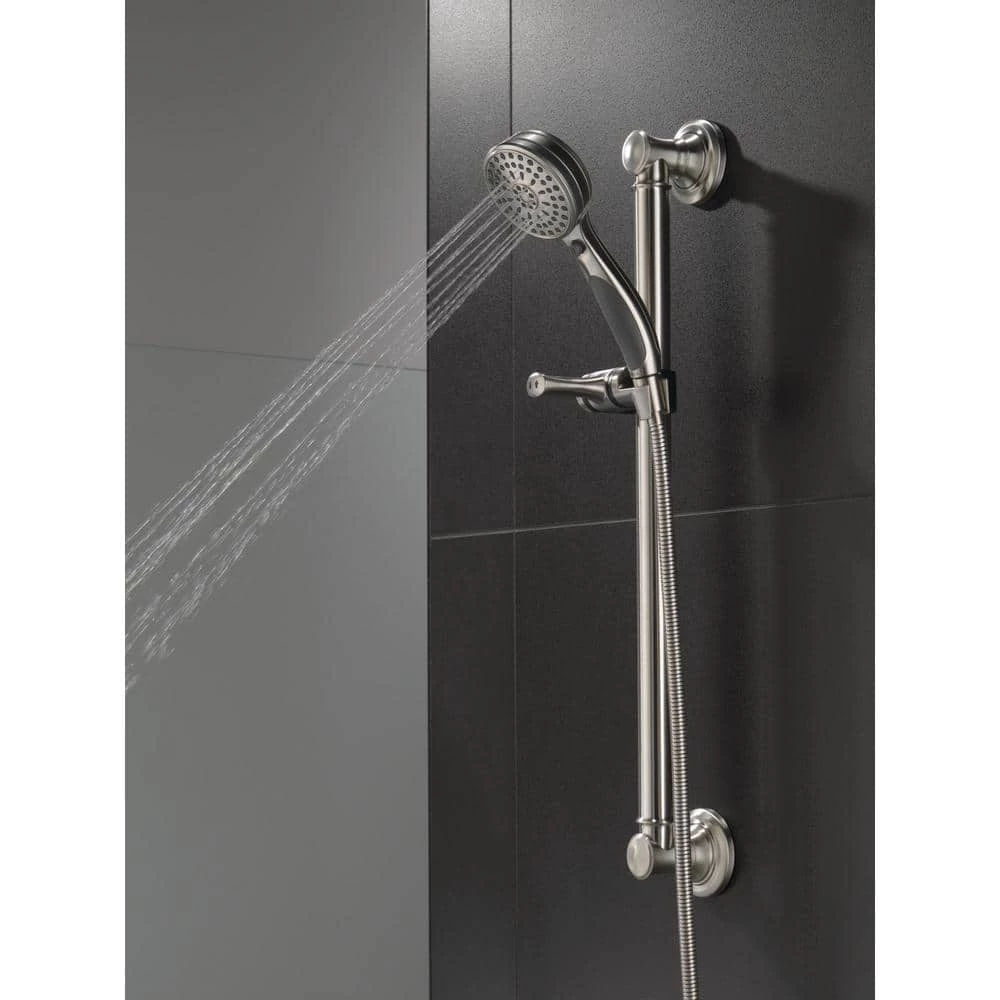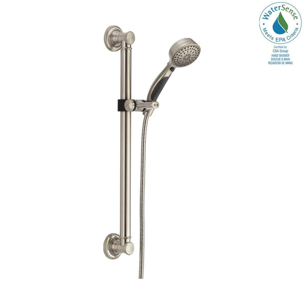 Delta Decorative Grab/Slide Bars are ADA Compliant. They can be positioned 33 to 36 in. above the finished floor. The bars do not rotate within the fittings and will support up to 500 lbs. of force, twice the ADA requirement of 250 lbs. of force, when properly installed. A retrievable grab/slide bar wall anchor is also included for ease of removal. Delta is committed to supporting water conservation around the globe and has been recognized as WaterSense Manufacturer Partner of the Year in 2011, 2013, and 2014. With 3 spray-selection buttons and a pause feature that allow you to choose up to nine spray settings with a simple, 1-handed activation, the ActivTouch hand shower delivers a new level of innovation to enhance the showering experience. The ActivTouch offers a non-slip, ergonomic grip to help prevent the hand shower from slipping out of the hand while in the shower. The 60 in. to 82 in. stretchable stainless steel hose option offers maximum flexibility. The impact-resistant spray face offers durability for years to come while the internal double-check valve offers peace of mind with back-flow protection. Innovative Pause feature allows you to conserve water while lathering up.