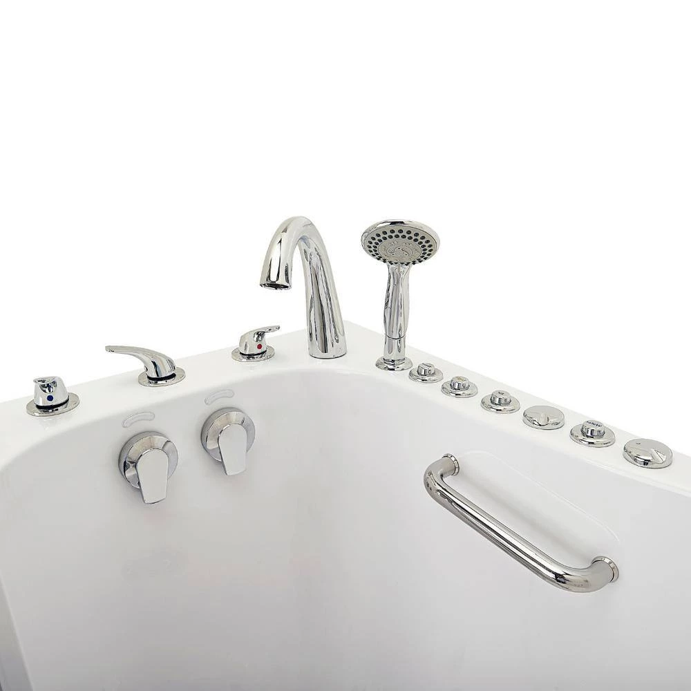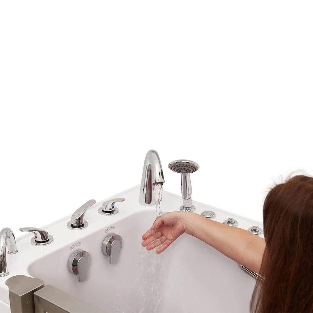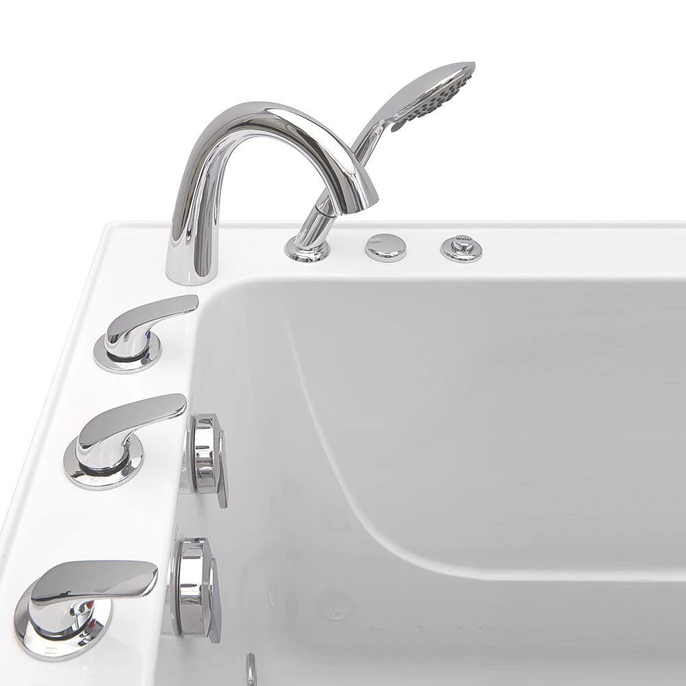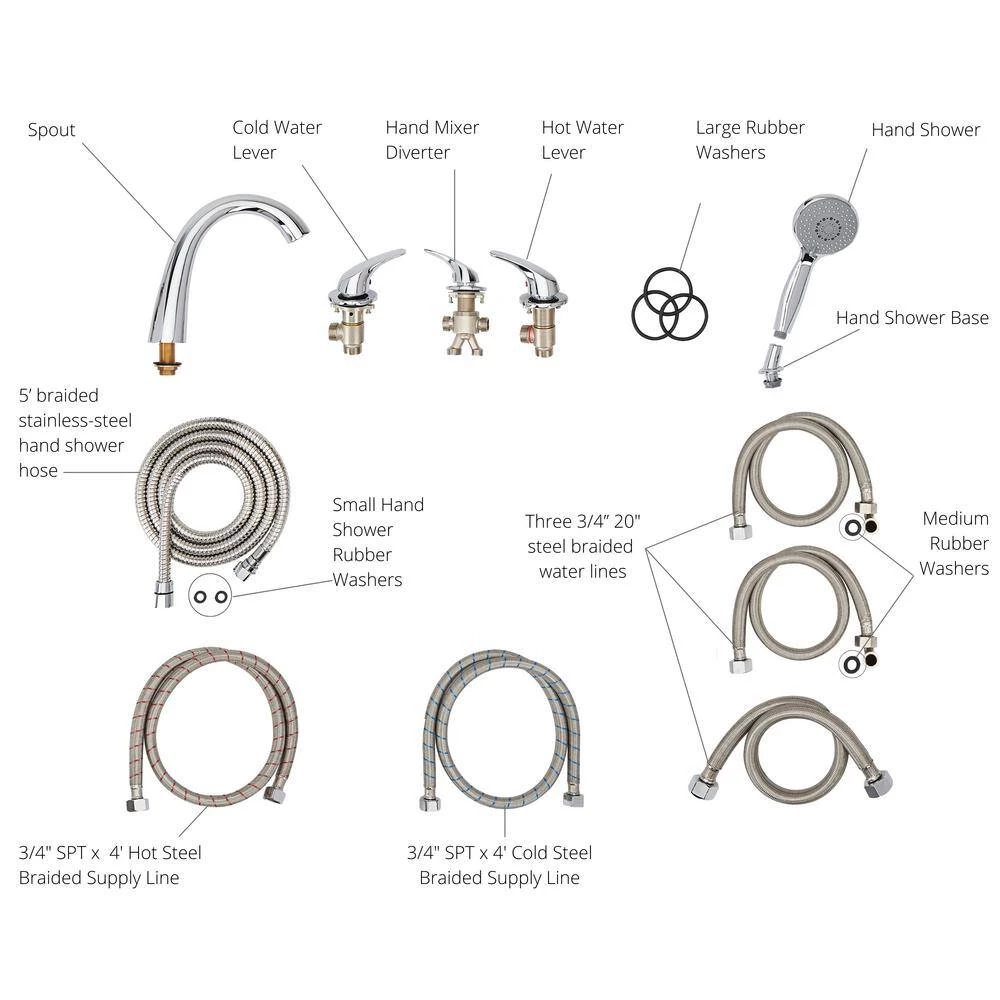 The Ella 5 Piece ¾” Fast Fill Faucet with pull out multi-function hand shower in chrome finish is perfect for your walk-in bathtub or any bathtub where fill time matters. The fast fill 5-piece fills at a rate of up to 18 GPM (gallons per minute) based on in house plumbing conditions. If desired, the pull-out hand shower can be used for showering while the bathtub is filled to stay warm. The Ella 5pc Fast Fill Faucet comes standard with two (2) 3/4″ braided-steal supply lines and a pull-out hand shower mixer with 5′ stainless-steel hose. The multi-function pull-out hand mixer has 3 water flow settings for the ultimate shower experience.