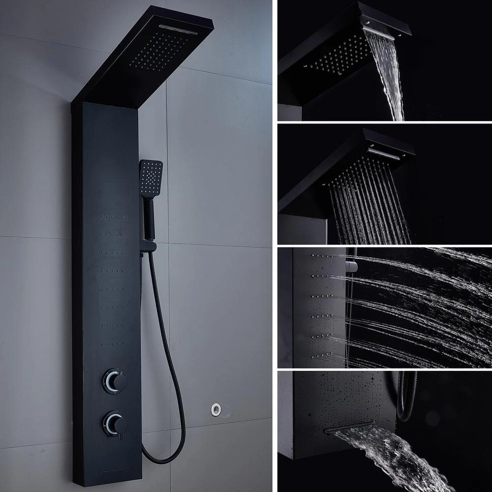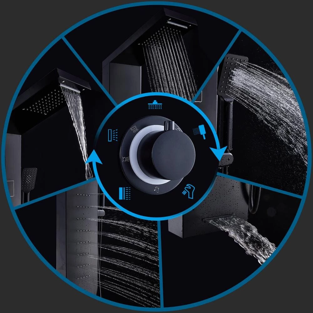 Premium multi-function shower massage panel with LED shower head for home and commercial use. Panel’s body is made of 304 stainless steel, cool 5 functions: rainfall, waterfall, massage jets, tub spout, hand shower. The system has hot and cold integrated mixing valve controls and diverter to redirect water from one function to another. Paired with the fact that it is pre-plumbed for easy installation, makes easy to love for years to come. This excellent shower tower will provide you a comfortable experience, drive away fatigue, relax your mind and body after showering. Luxury color, easy to match modern room decorations.