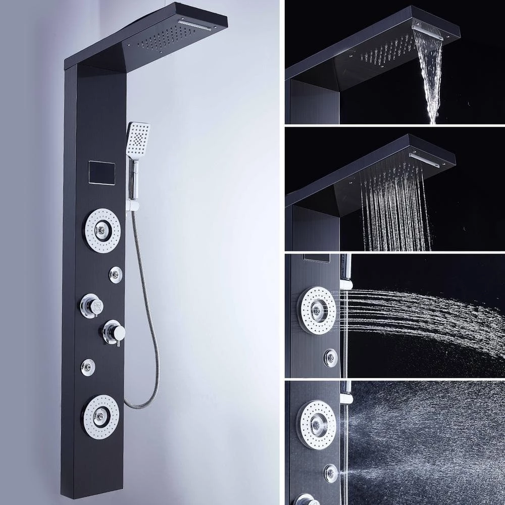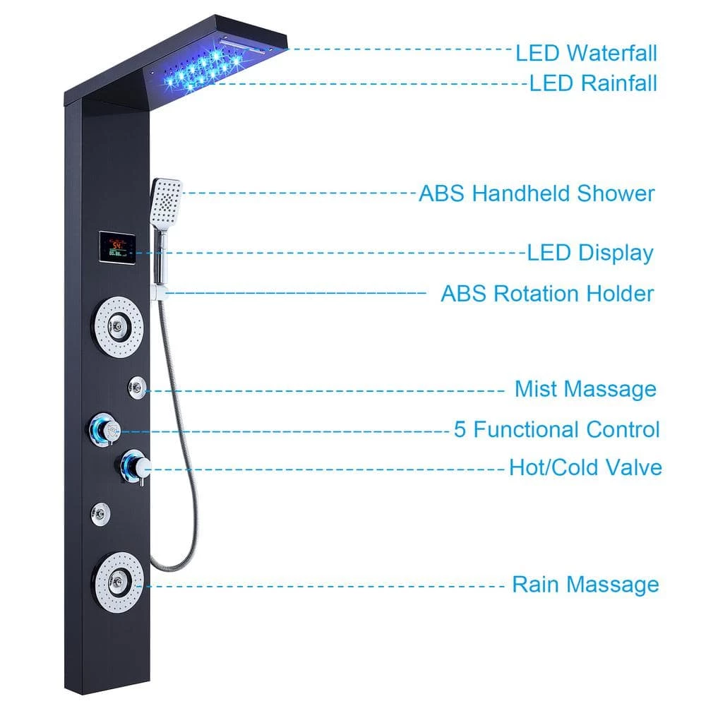 - Luxury shower panel has built-in LED temperature display, LED overhead rainfall showerhead, adjustable high-powered body massage jets, and high-efficiency multi-function handheld shower wand