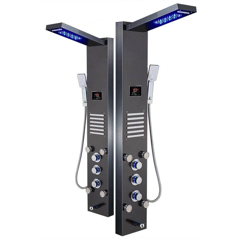 - Luxury shower panel has built-in LED temperature display, LED overhead rainfall showerhead, adjustable high-powered body massage jets, tub spout, and high-efficiency multi-function handheld shower wand