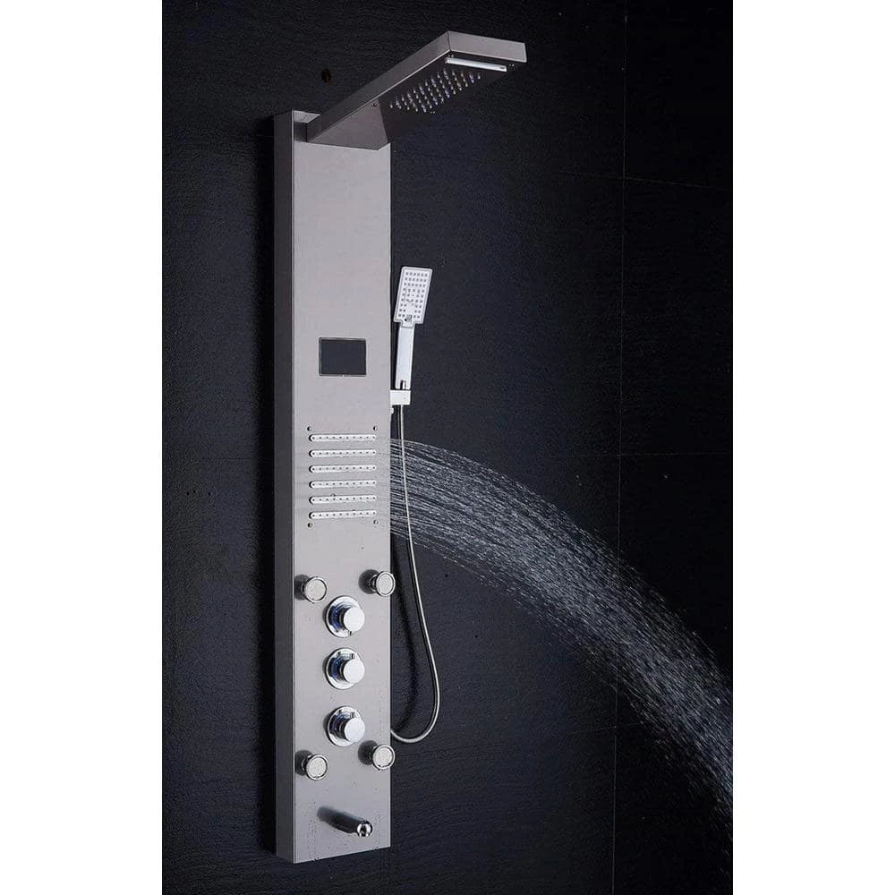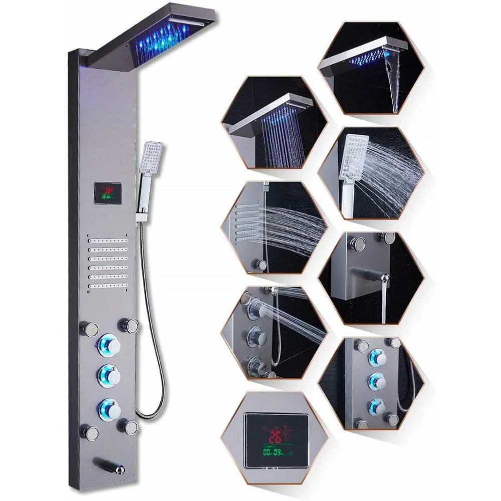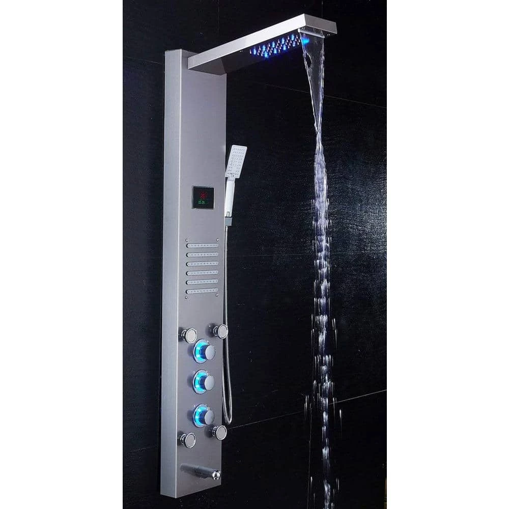 - Luxury shower panel has built-in LED temperature display, LED overhead rainfall showerhead, adjustable high-powered body massage jets, tub spout, and high-efficiency multi-function handheld shower wand