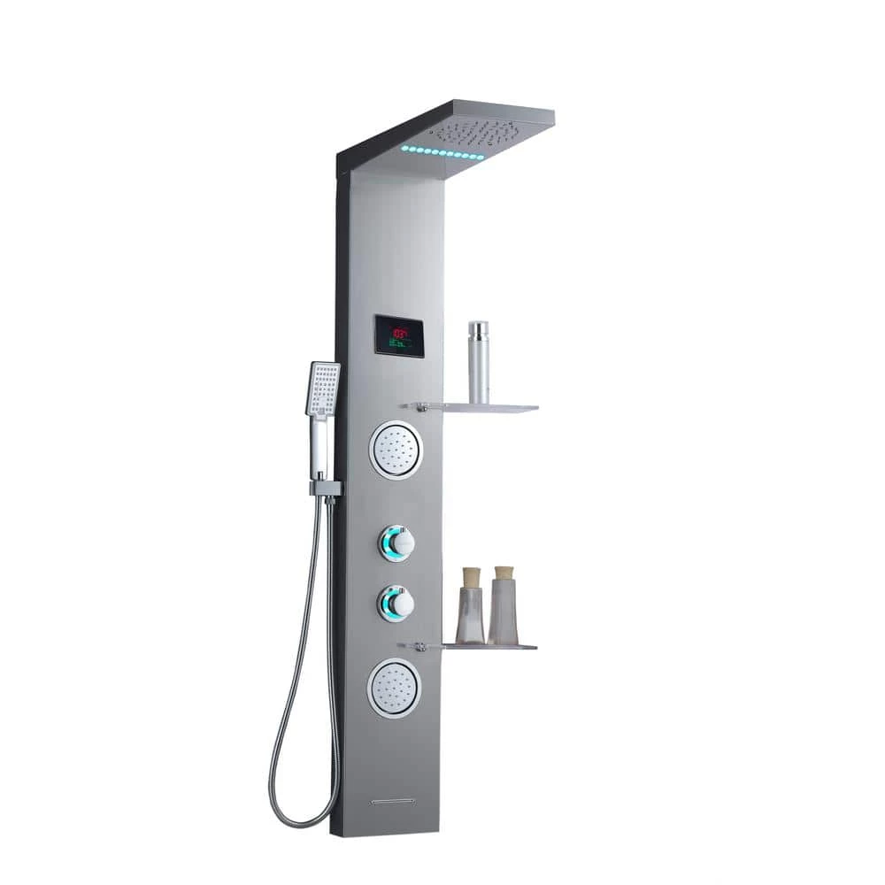 - Luxury shower panel has built-in LED temperature display, LED overhead rainfall showerhead, adjustable high-powered body massage jets, tub spout, and high-efficiency multi-function handheld shower wand
