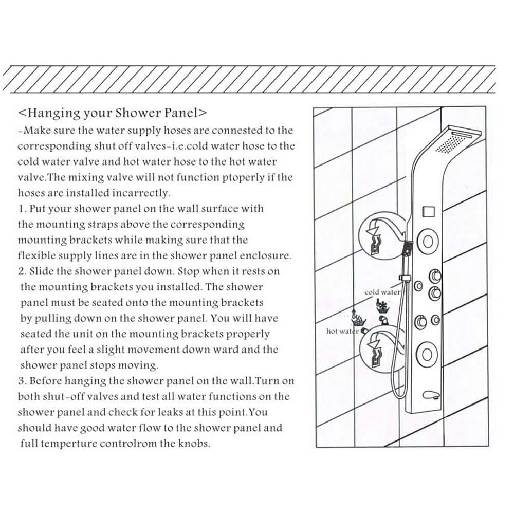 “Premium multi-function shower massage panel with LED shower head for home and commercial use. Panel’s body is made of 304 stainless steel, CHROME hand shower and tub spout. cool 5 functions: rainfall, waterfall, massage jets, tub spout, 3 setting hand shower. The system has hot and cold integrated mixing valve controls and diverter to redirect water from one function to another. Paired with the fact that it is pre-plumbed for easy installation, makes easy to love for years to come. This excellent shower tower will provide you a comfortable experience, drive away fatigue, relax your mind and body after showering. Luxury color, easy to match modern room decorations.”