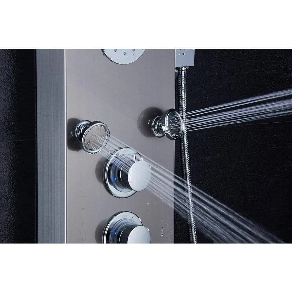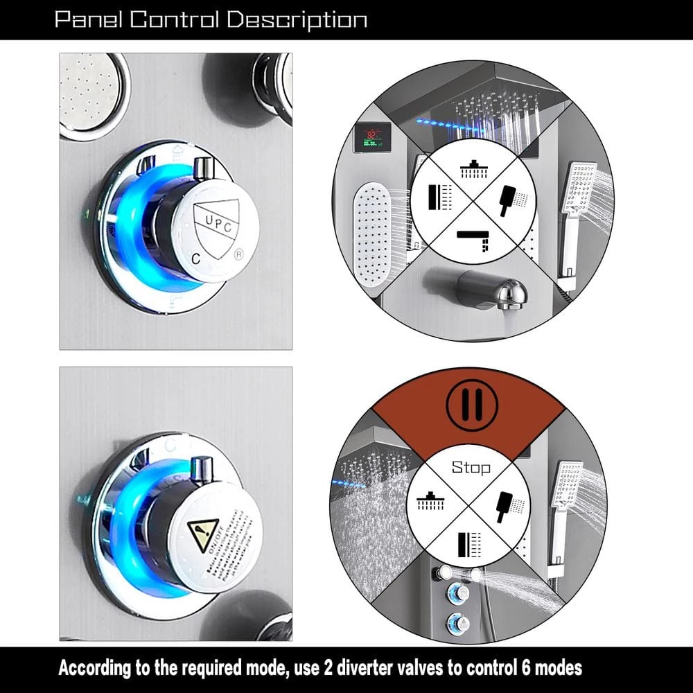 - Luxury shower panel has built-in LED temperature display, LED overhead rainfall showerhead, adjustable high-powered body massage jets, tub spout, and high-efficiency multi-function handheld shower wand