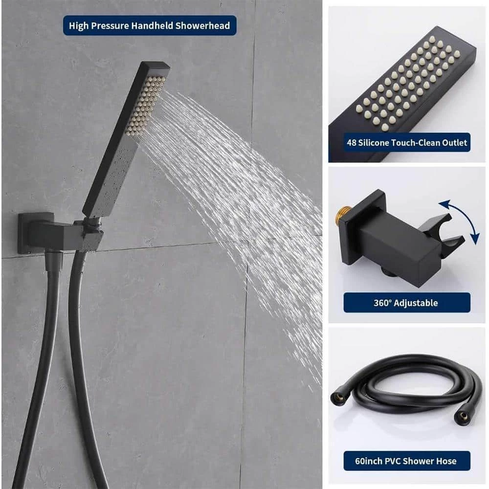 - Included components: shower arm, rain shower head, handheld shower head, shower valve faucet, shower bracket holder, shower hose
