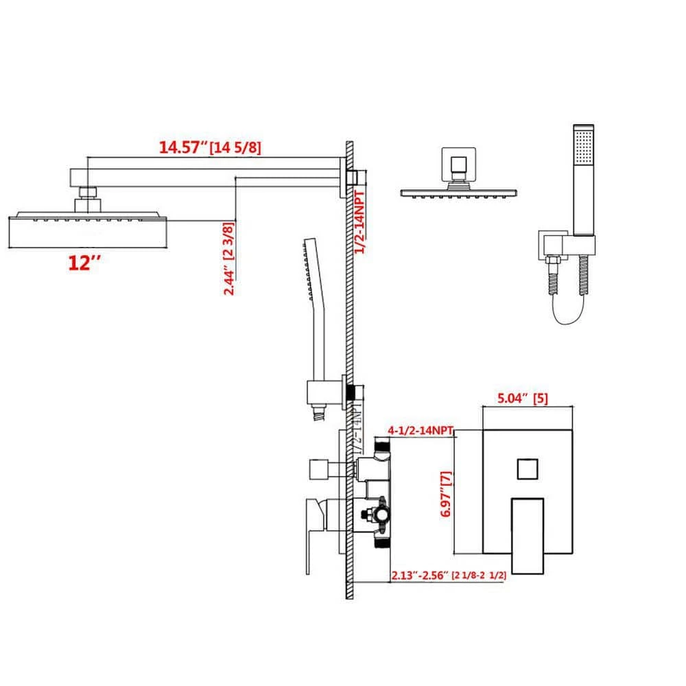 - Shower head width: 12 in., shower head height: 2.44 in., shower arm length: 14.57 in.