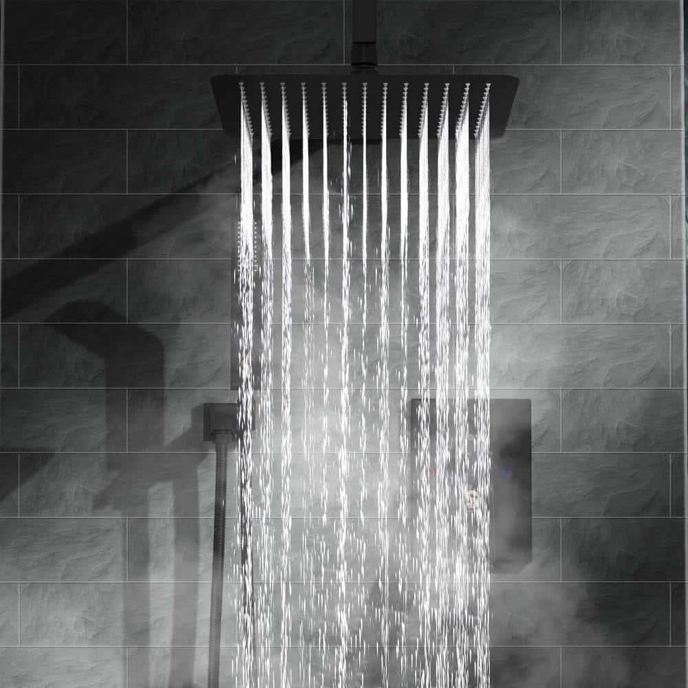 - Includes: 16 in. matte black square rain shower head, handheld shower head, 7.87 in. brass shower arm wall mounted