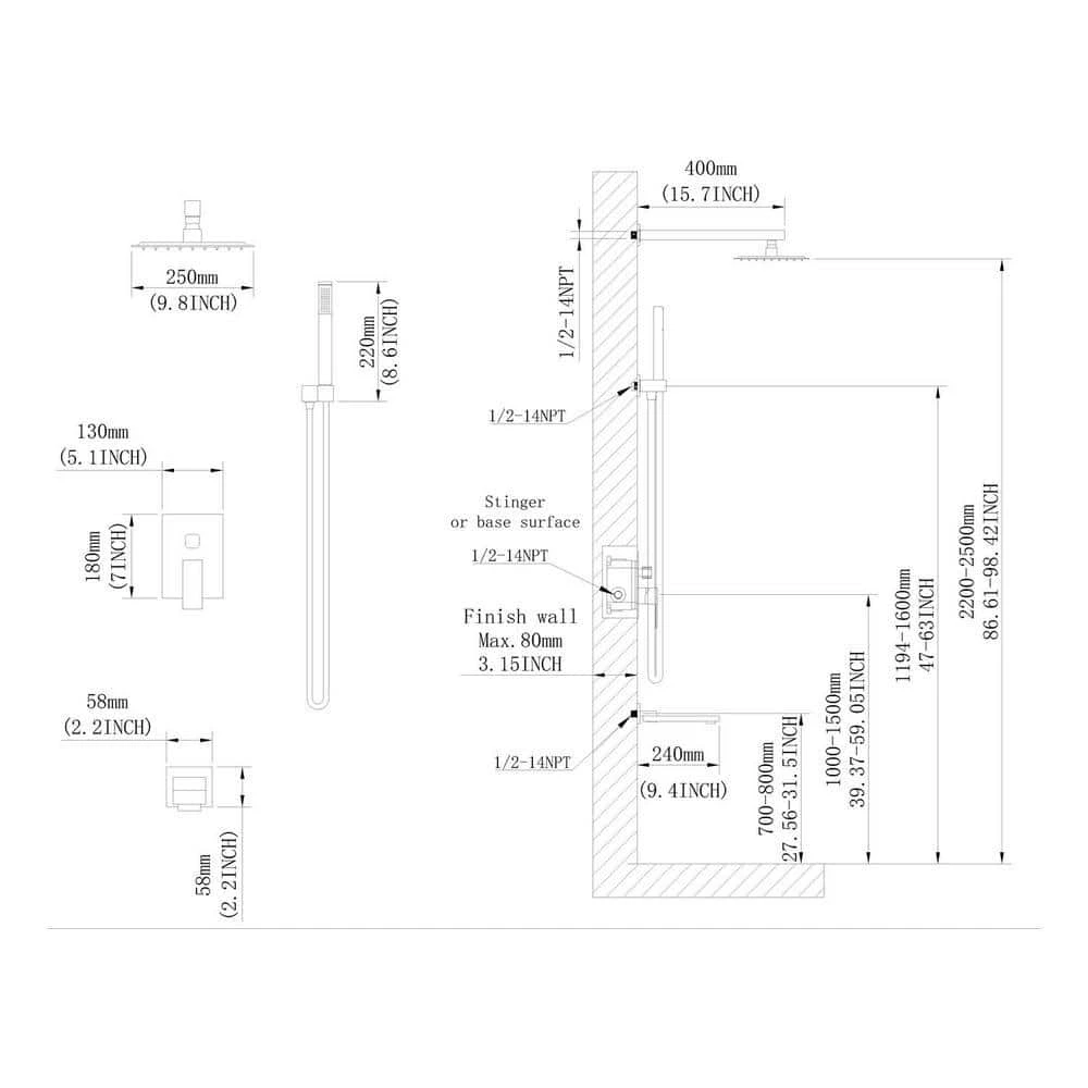 - 2.0 GPM hand-held shower head, 2.5 GPM large stainless steel square rainfall shower head good performance even in low water pressure installations