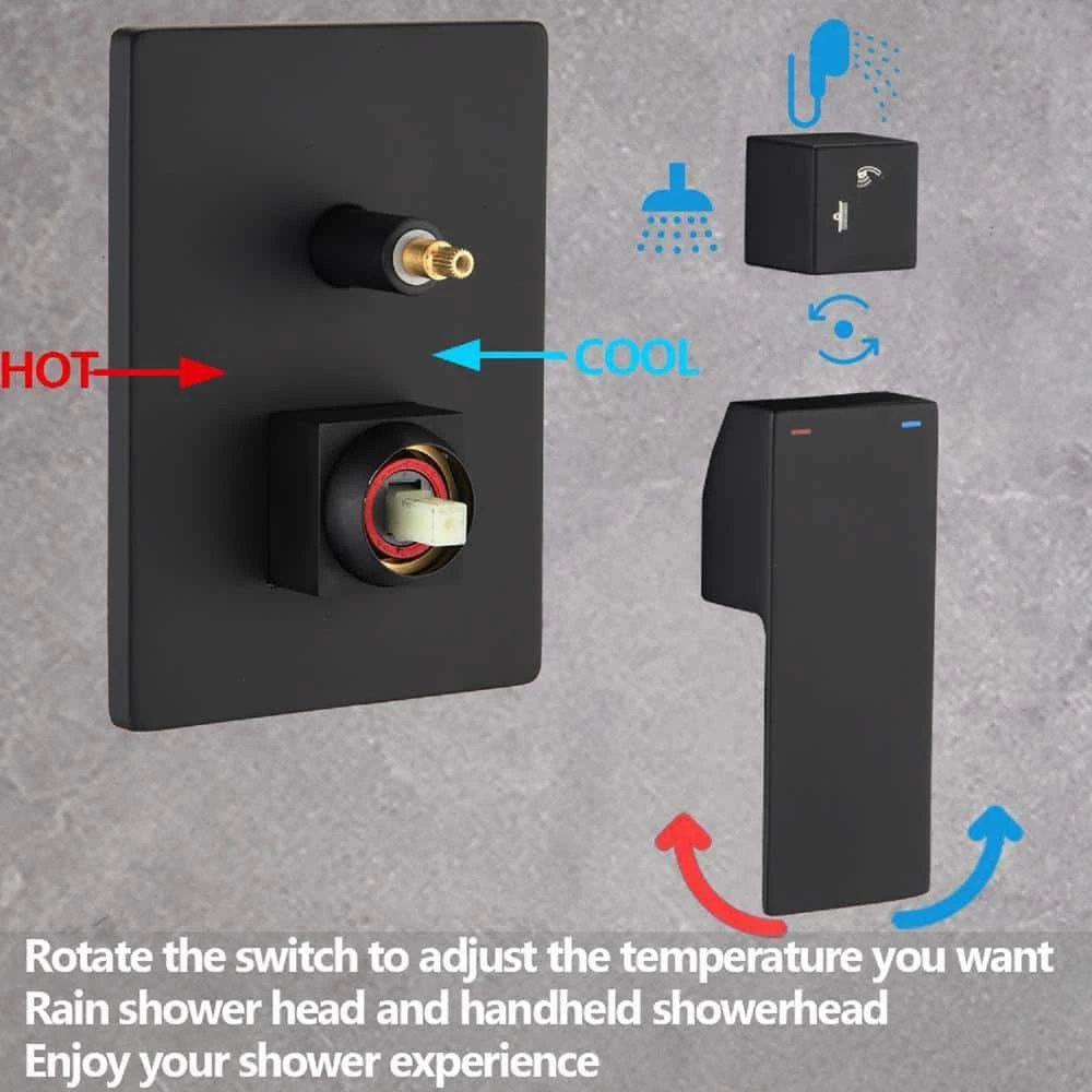 - Special design of solid brass shower mixer valve: shower knob on the valve switches the bathing modes, single handle for easy control of water flow and temperature
