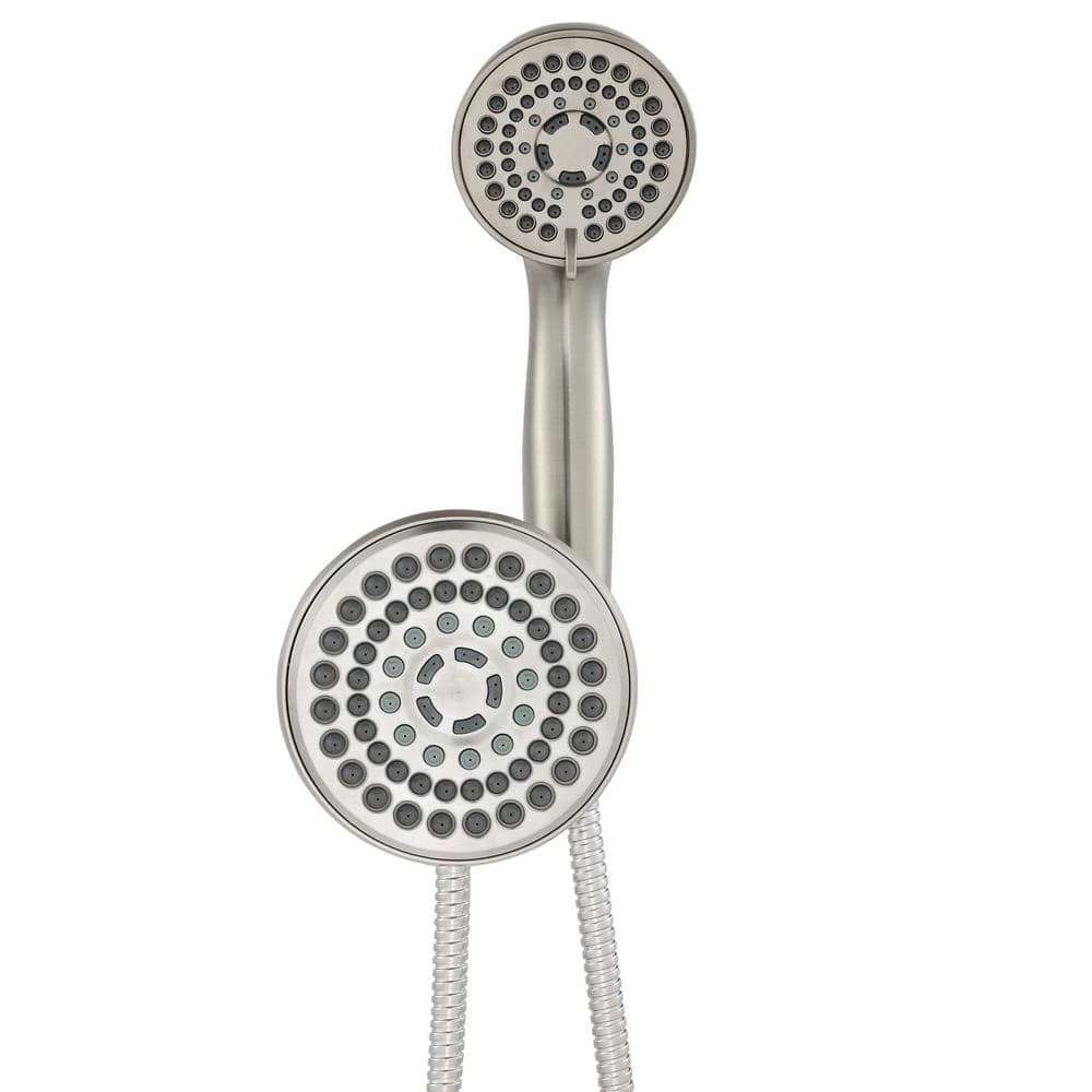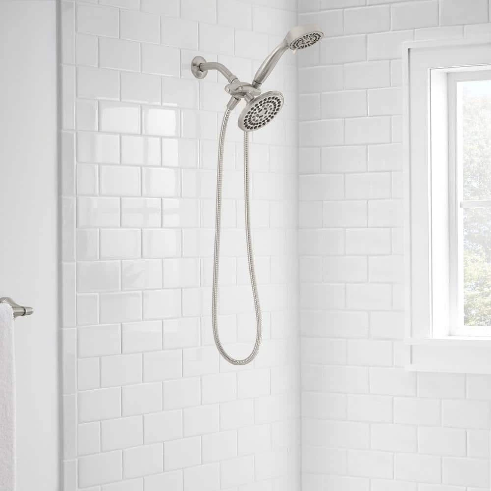 Enhance your bathroom interior with this Glacier Bay 5.5-in. dual shower head and handheld shower head. For a comfortable shower experience, it includes six settings, a 3-way diverter and a 60-in. hose. This WaterSense-certified shower head uses less water while maintaining high performance. Stainless steel construction with a brushed nickel finish makes it built to last