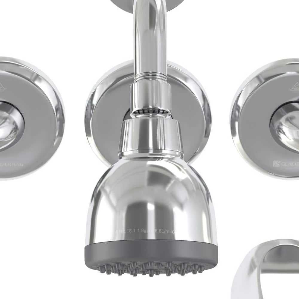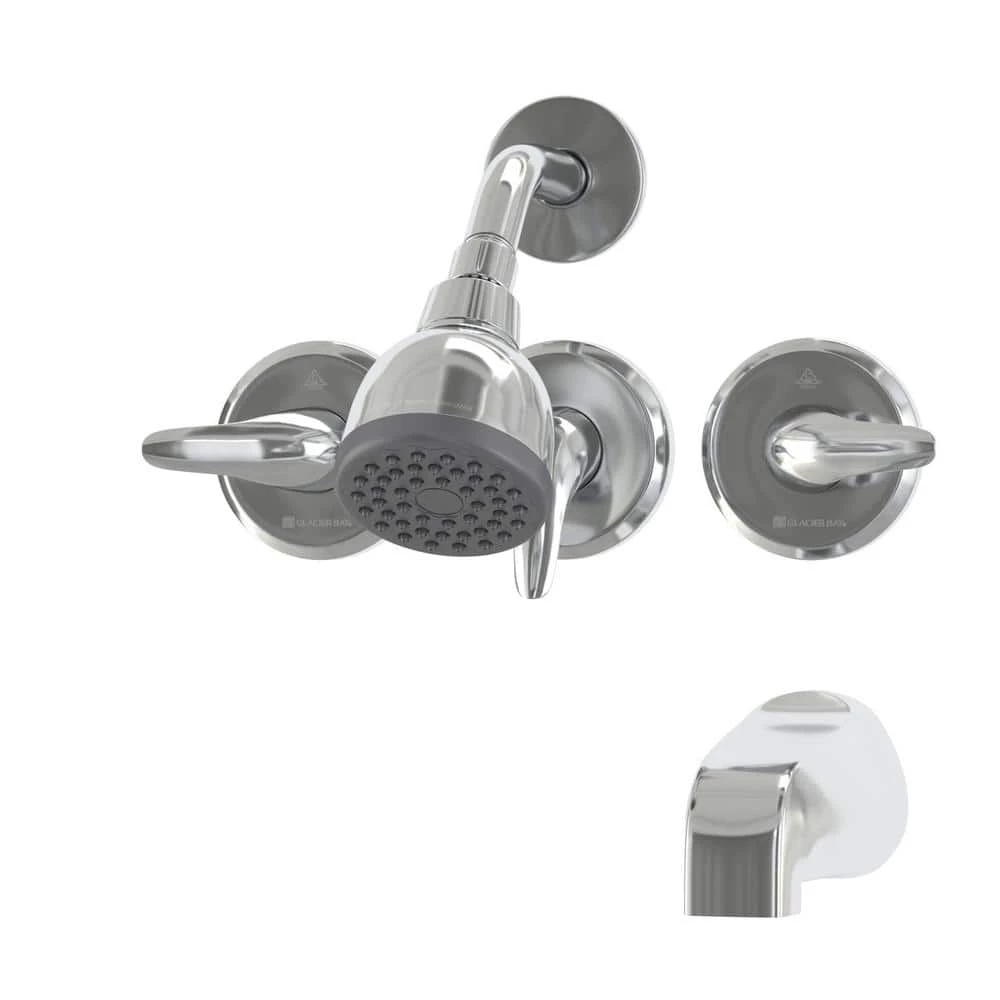 The Glacier Bay WaterSense Aragon 3-handle 1-spray tub and shower faucet in chrome is practical and attractive and will complement a wide variety of bathroom decor. WaterSense certified, this faucet has a 1.8 GPM rate to help reduce water use. The 3-handle lever handle design allows you to precisely control water flow and temperature, while the single-function shower head provides consistent water flow for an enjoyable shower experience. Durable with an easy to clean chrome finish. Pair with other pieces from the Aragon Collection for a complete and polished look.