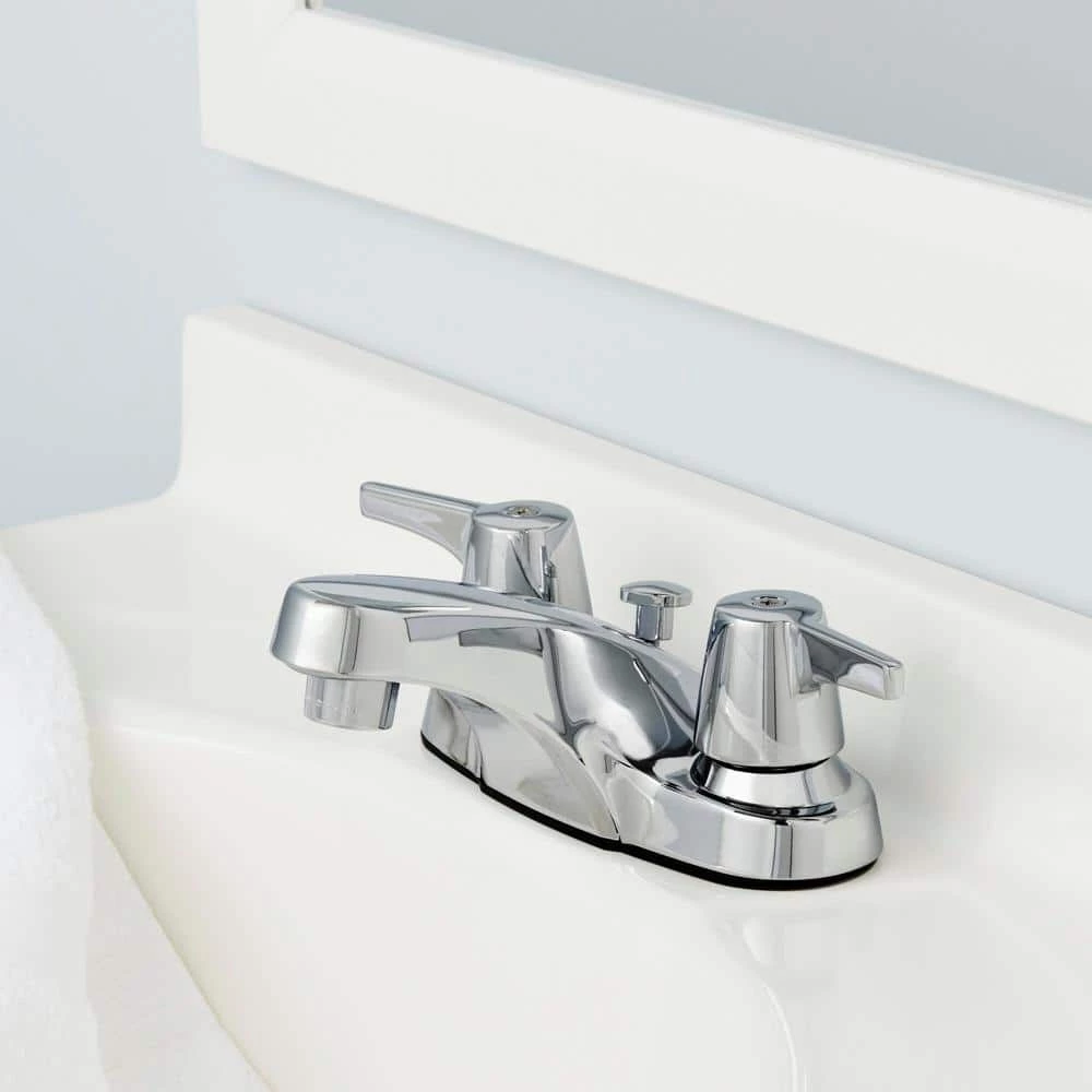 The Glacier Bay Aragon 4 in. 2-Handle Low Arc Bathroom Faucet with Pop-Up Drain in Chrome combines durability with functionality and complements a wide variety of bathroom decor. WaterSense certified with a 1.2 GPM water flow to help reduce water use, this faucet has washerless valves to help prevent dripping. The 2-handle lever design and low-arc spout make this faucet easy to use, while the 1/2 in. connection and deck plate mount make it easy to install. This faucet features the Glacier Bay exclusive Clickinstall drain assembly for quick and simple installation. Pair with other pieces from the Aragon Collection for a complete and polished look. Limited lifetime warranty.