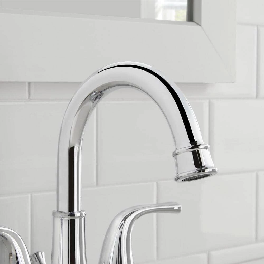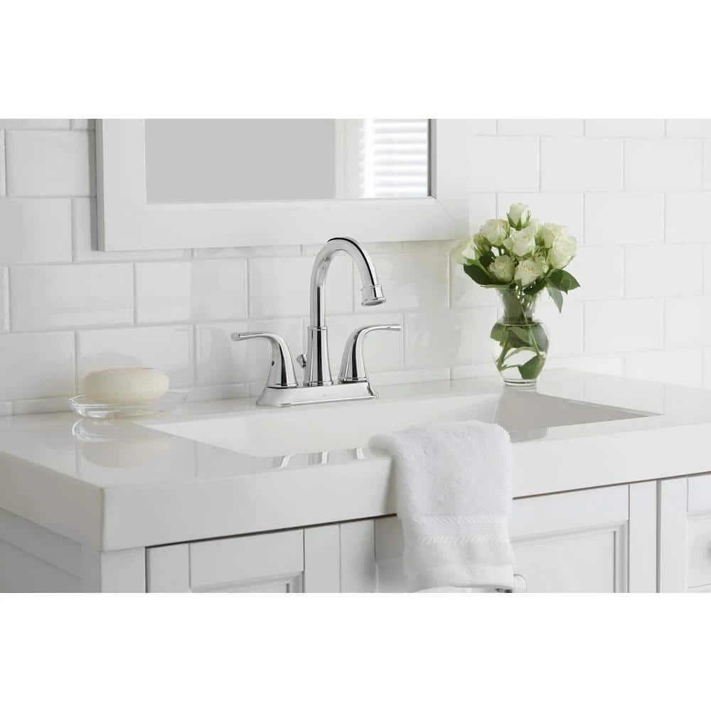 The Glacier Bay Bettine 4 in. Centerset 2-Handle High-Arc Bathroom Faucet in Chrome features a classic look that will fit with any decor style. WaterSense certified with a 1.2 GPM water flow and ceramic disc cartridges to reduce water use without sacrificing performance, this faucet will meet all your needs. The high-arc spout allows for plenty of sink space. This faucet features the exclusive ClickInstall drain assembly for quick and easy installation.