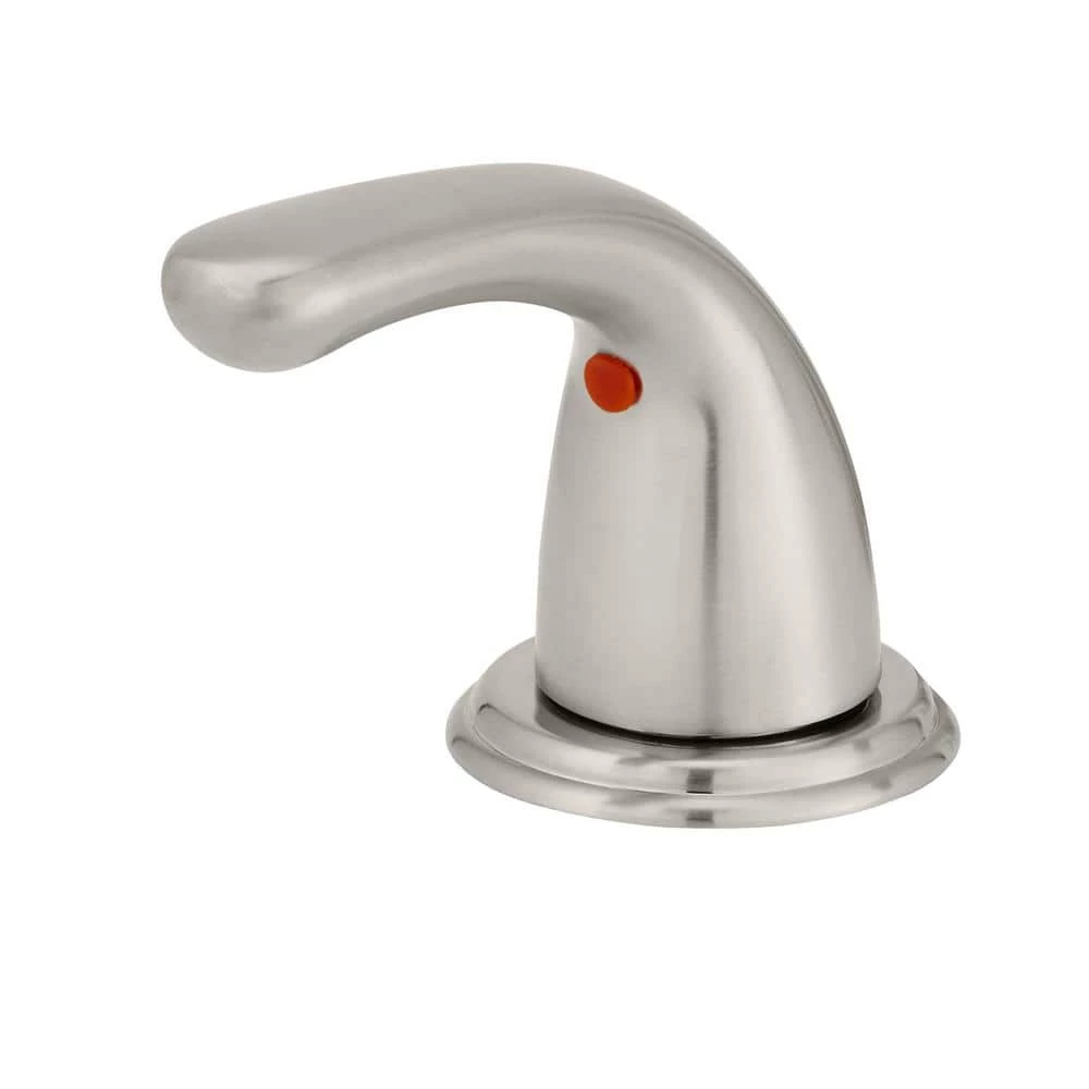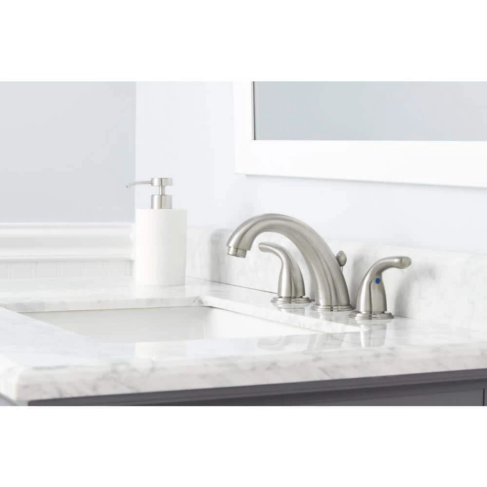 The Builders Widespread 2-Handle High-Arc Bathroom Faucet from Glacier Bay in brushed nickel finish offers an attractive curved design with smooth, soft lines. WaterSense certified, this efficient faucet features a 1.2 GPM flow rate to help reduce water use and ceramic disc cartridges to prevent drips. Easy to use with dual lever handles and a high-arc spout, it features the Glacier Bay exclusive ClickInstall drain for quick and simple installation. Pair with other pieces from the Builders collection to create a stylish theme throughout your bathroom.