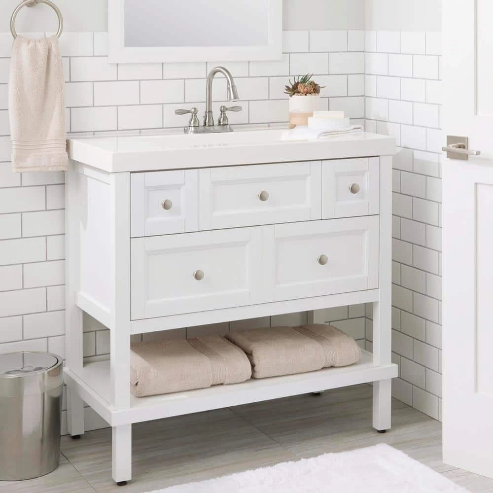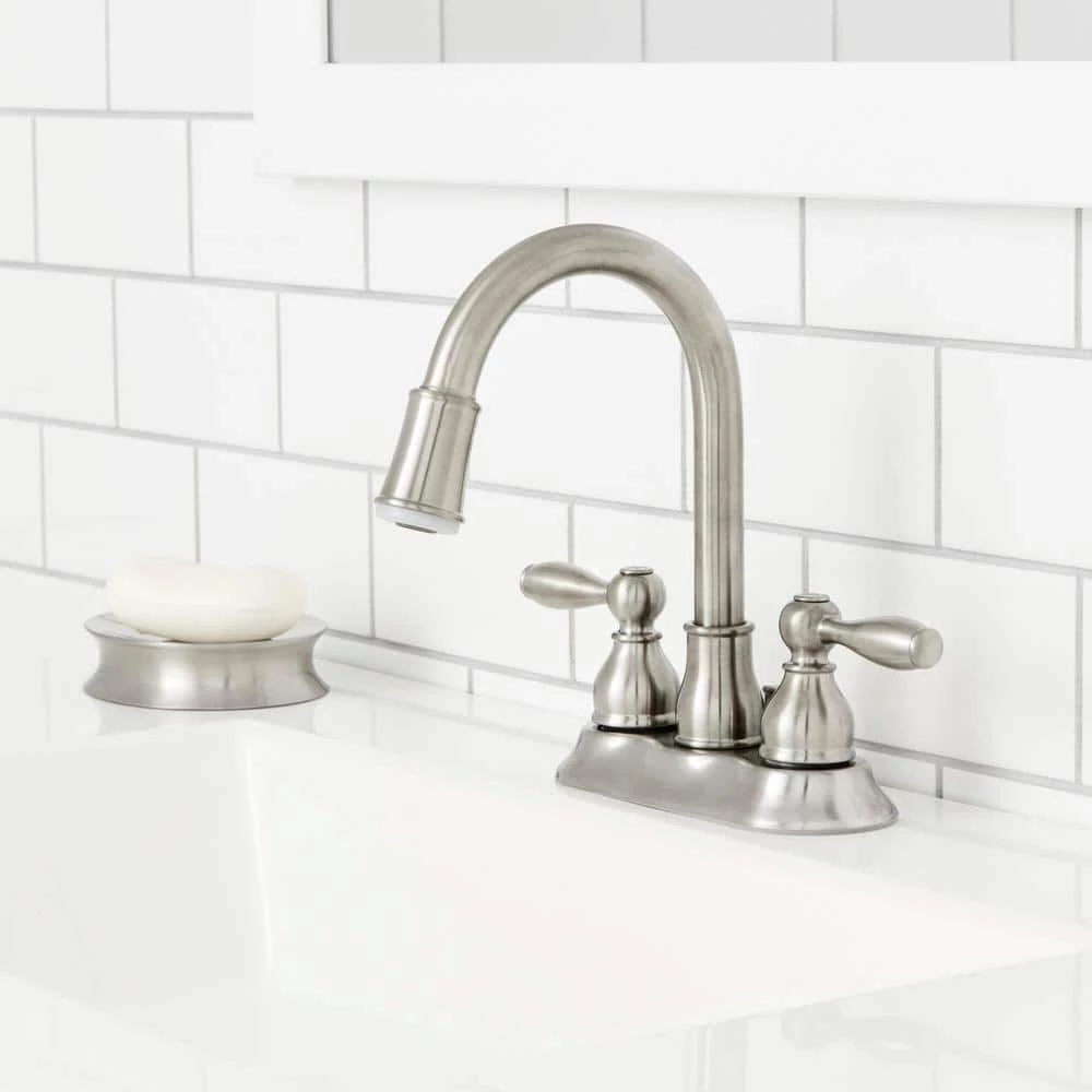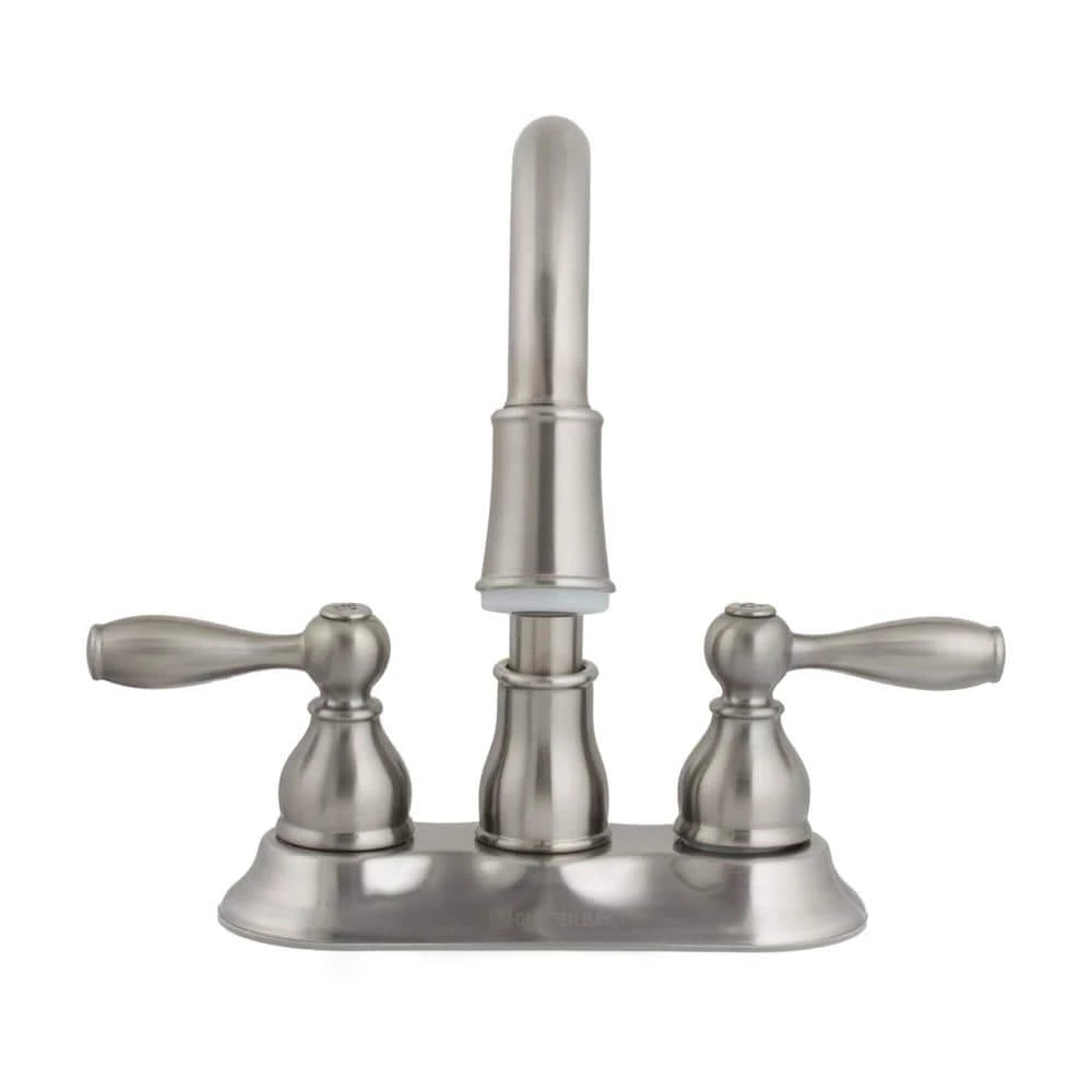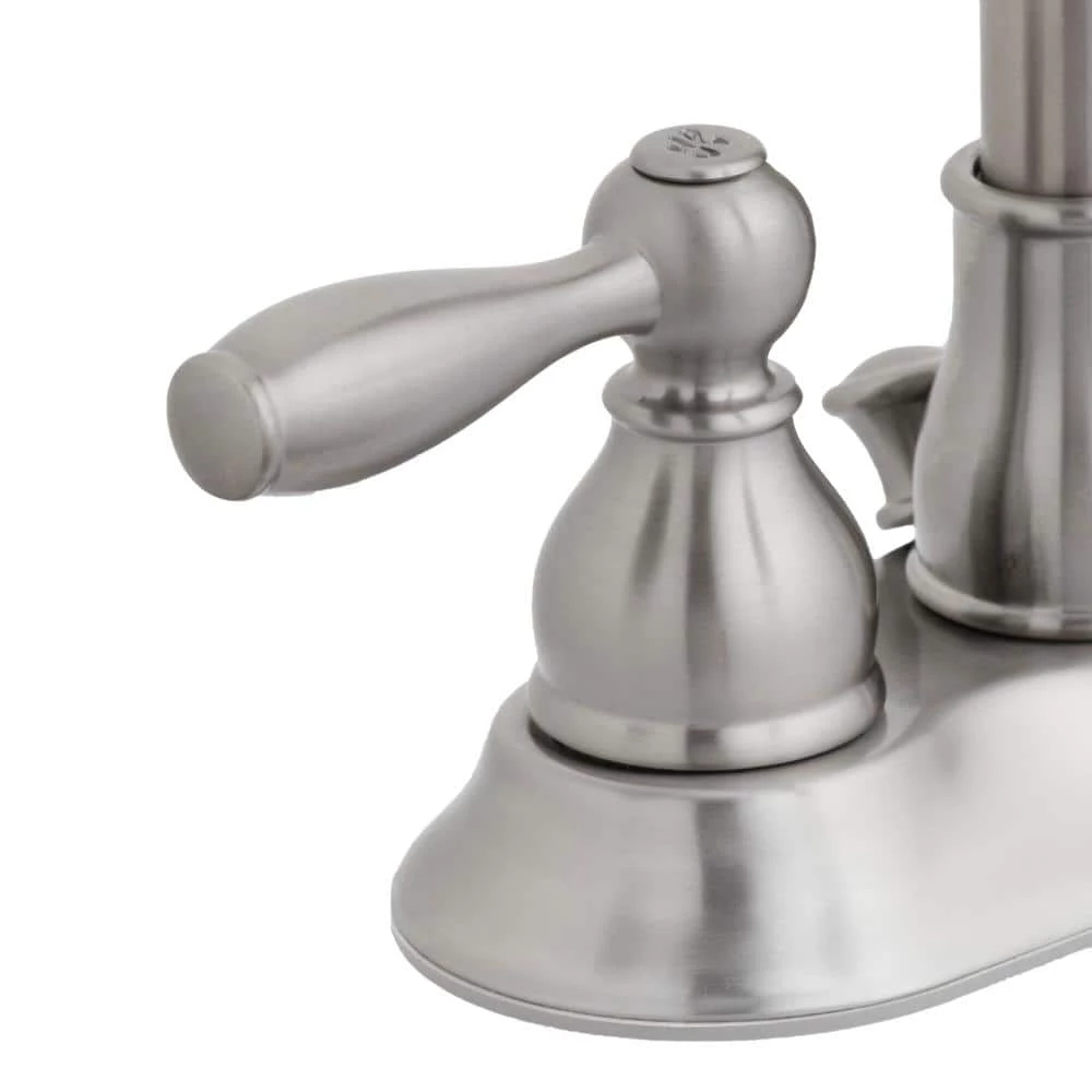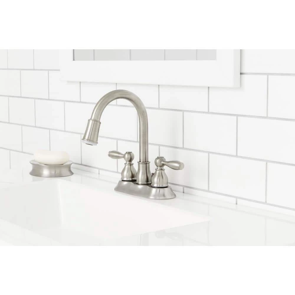 The Glacier Bay Mandouri 4 in. 2-Handle High-Arc Bathroom Faucet in Brushed Nickel has a traditional look that will complement a wide variety of bathroom decor. The faucet features an LED aerator that runs off of the kinetic energy generated from the flow of water. The LED is a bright white light which is both stylish and functional. The faucet is also WaterSense certified and has a 1.2 GPM flow rate to help reduce water use and ceramic disc cartridges to prevent drips. The high-arc spout design provides plenty of sink space, while the beautifully styled handles allow easy and convenient control of water flow and temperature. This Faucet features the Glacier Bay Exclusive ClickInstall drain for quick and simple installation. The brushed nickel finish is durable and attractive. Pair with other pieces from the Mandouri Collection for a complete look.