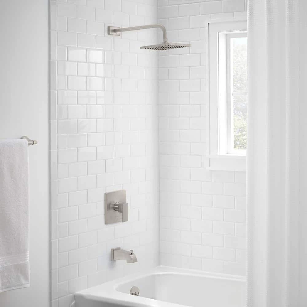 The Glacier Bay Marx Single-Handle 1-Spray Tub and Shower in Brushed Nickel provides a sleek modern design at an affordable price. This unit includes the rough-in valve to provide a one stop solution for your shower upgrade. WaterSense certified, this faucet has a 1.8 GPM rate to help reduce water use and a ceramic valve for smooth operation and long life. While the unit uses less water, the showerhead provides a superb showering experience. Featuring an 8 in. W spray face, the showerhead provides an increased spray force and a wider spray pattern. The single-handle design gives you convenient, 1-handed control over water flow and temperature. This unit includes a pressure balancing system to ensure a comfortable and consistent showering experience.