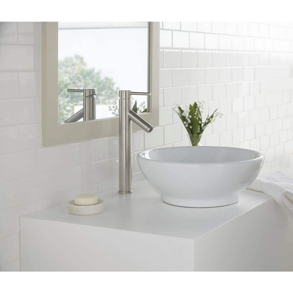 Give your bathroom a fresh, bright look with the Glacier Bay Modern Single Hole Single-Handle Vessel Bathroom Faucet in Brushed Nickel. WaterSense certified, this faucet delivers a 1.2 GPM flow rate to help conserve water and a ceramic disc cartridge to prevent drips. Easy to use with a single-handle design and a high-arc spout for plenty of sink room, the faucet is beautifully finished in brushed nickel to complement any decor. Pair this vessel bathroom faucet with other pieces in the Modern collection for a complete and polished look.
