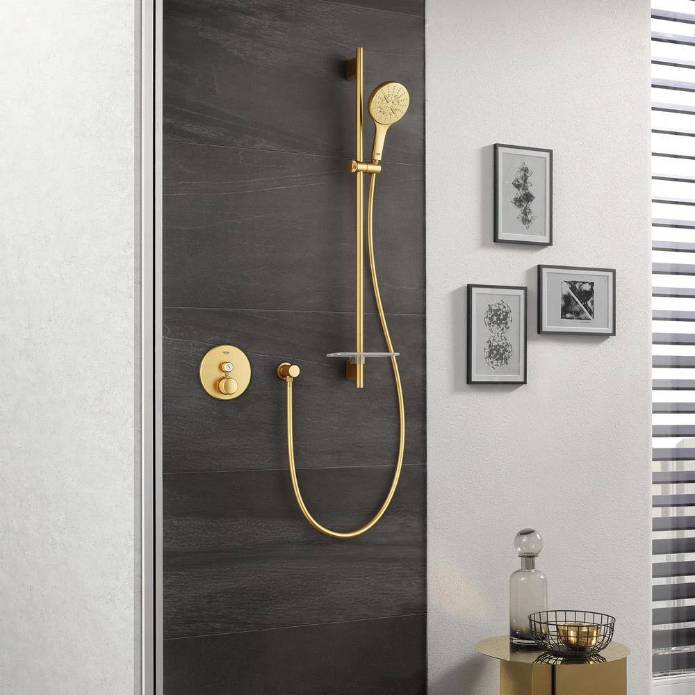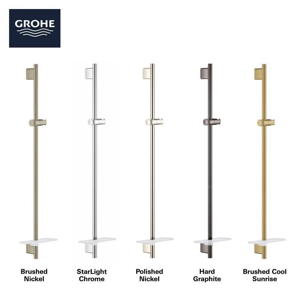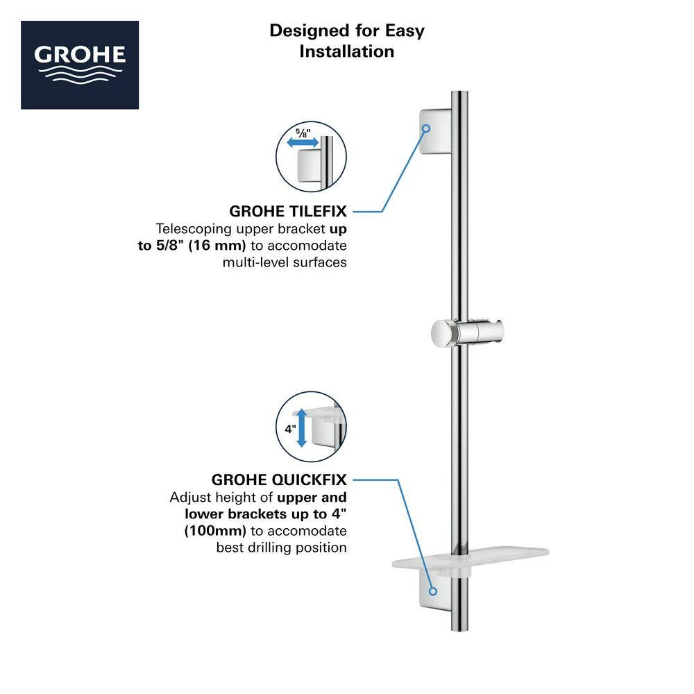 The sleek, slim GROHE Rainshower Slide Shower Bar adds understated elegance to your bathroom. Designed for maximum versatility, the hand shower holder adjusts for the perfect angle, the height-adjustable glider swivels to accommodate left or right-hand preference. Includes EasyReach tray for added convenience.